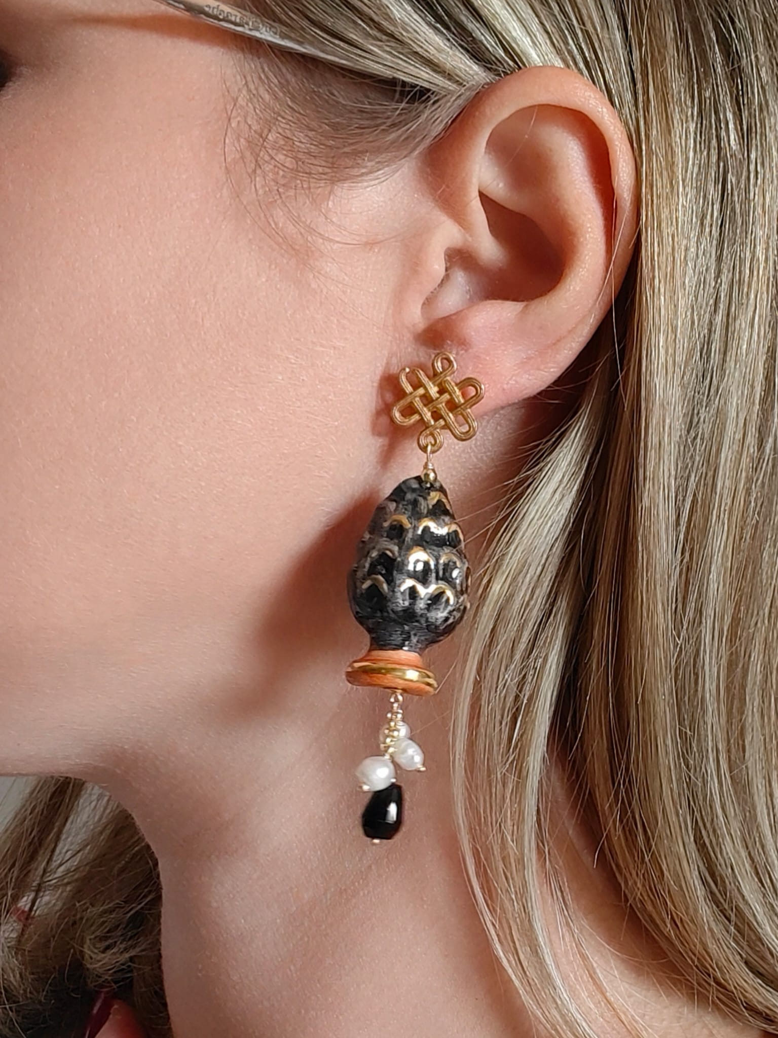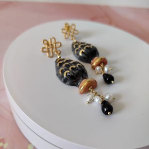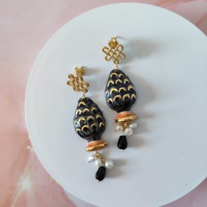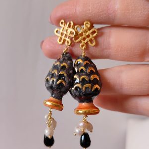 Ogni orecchino pigna Caltagirone è una piccola opera d’arte. Le perle d’acqua dolce aggiungono un tocco di purezza e luce, mentre l’onice nero conferisce profondità e mistero.