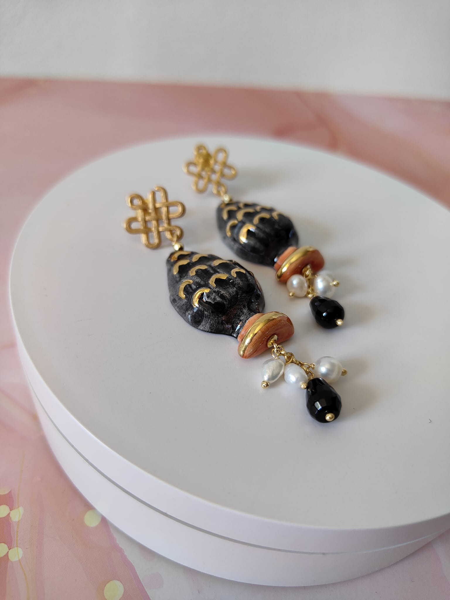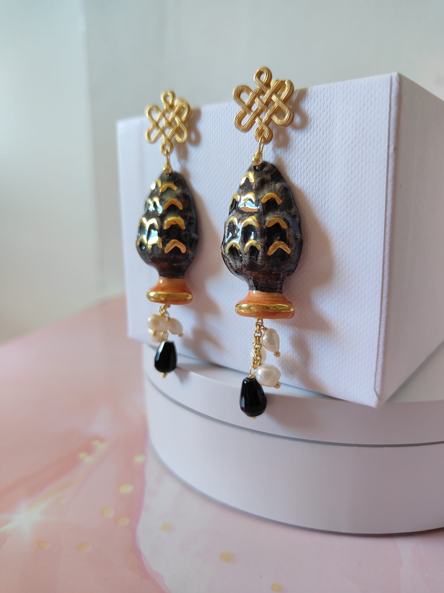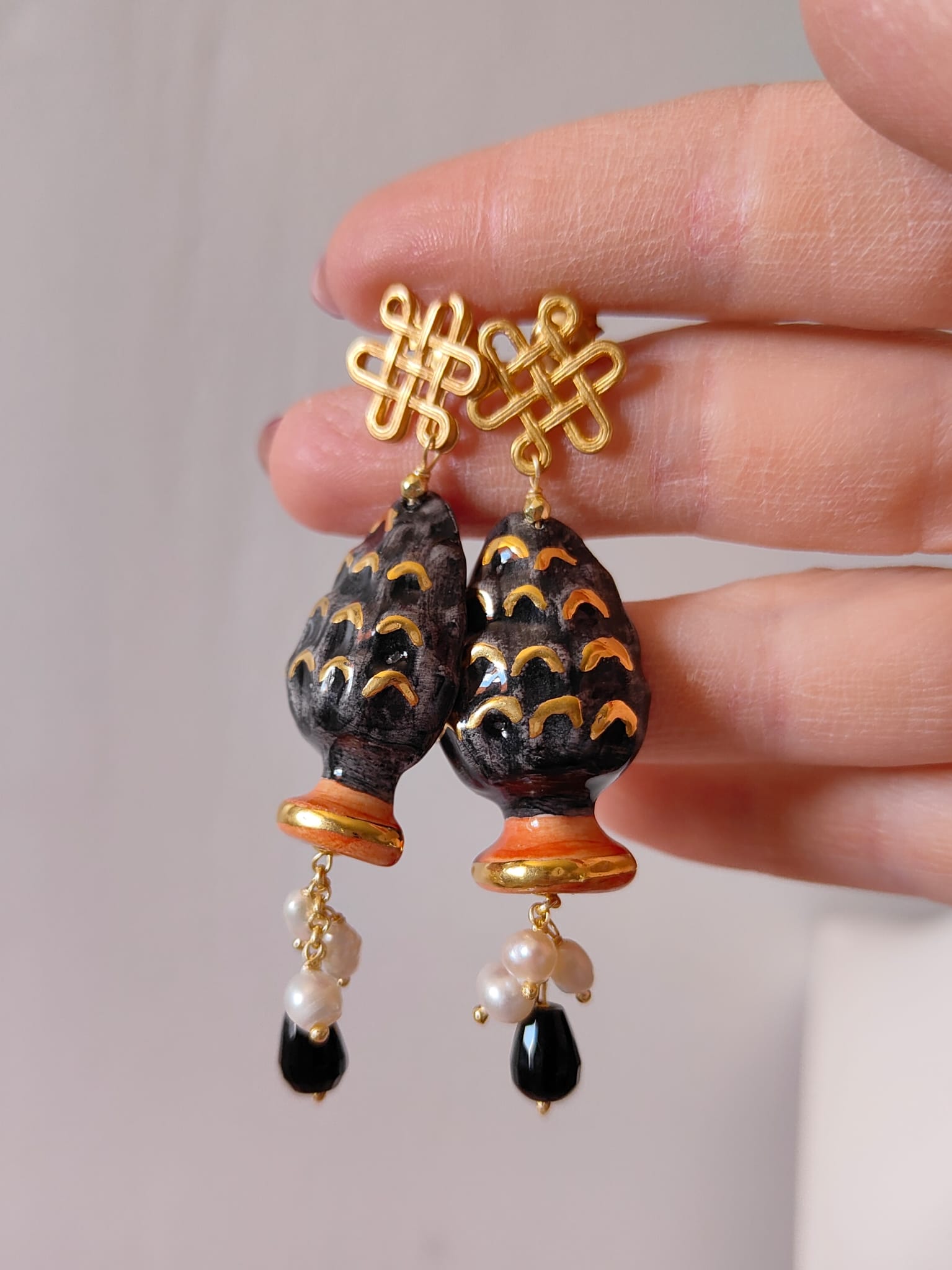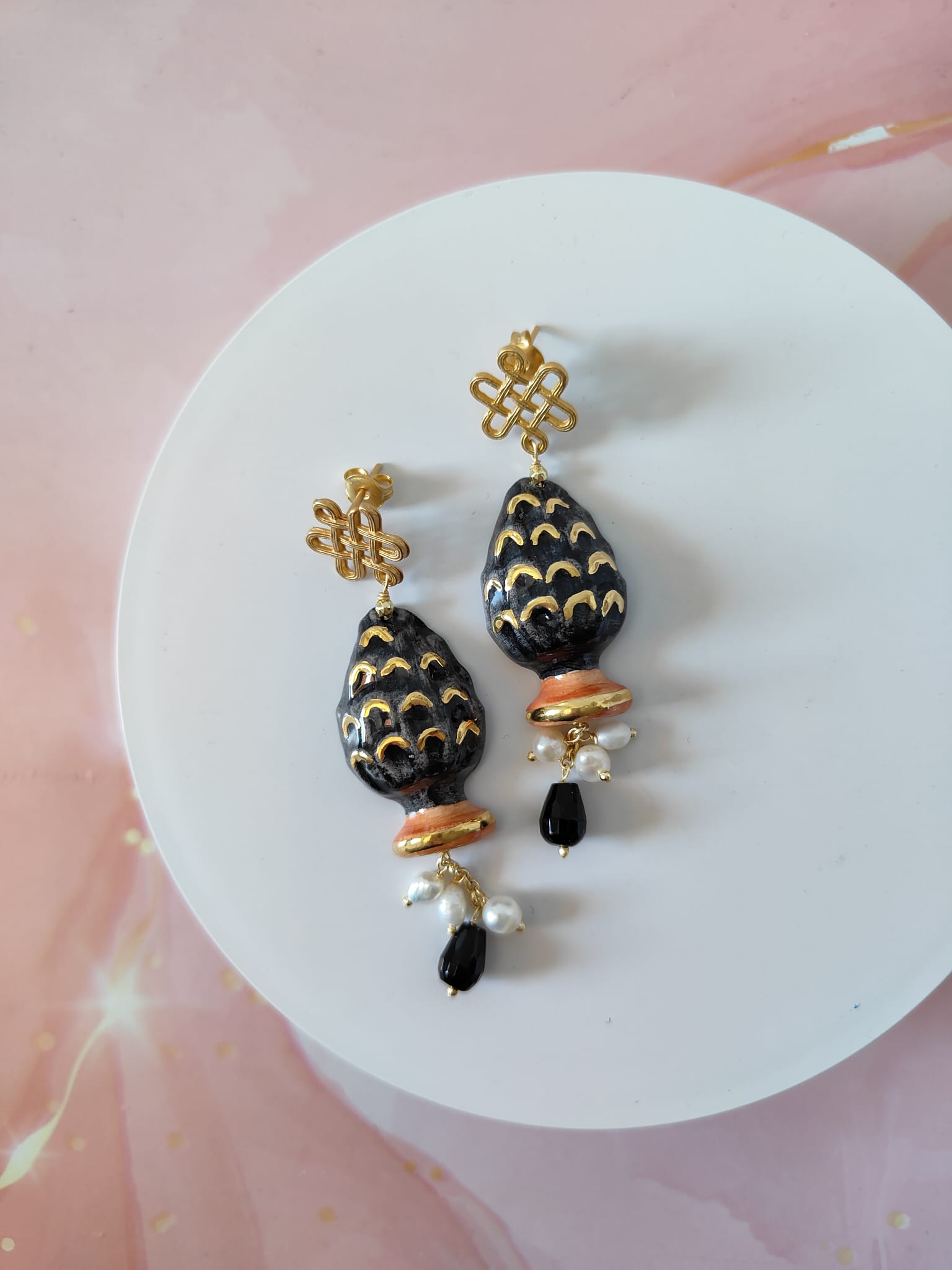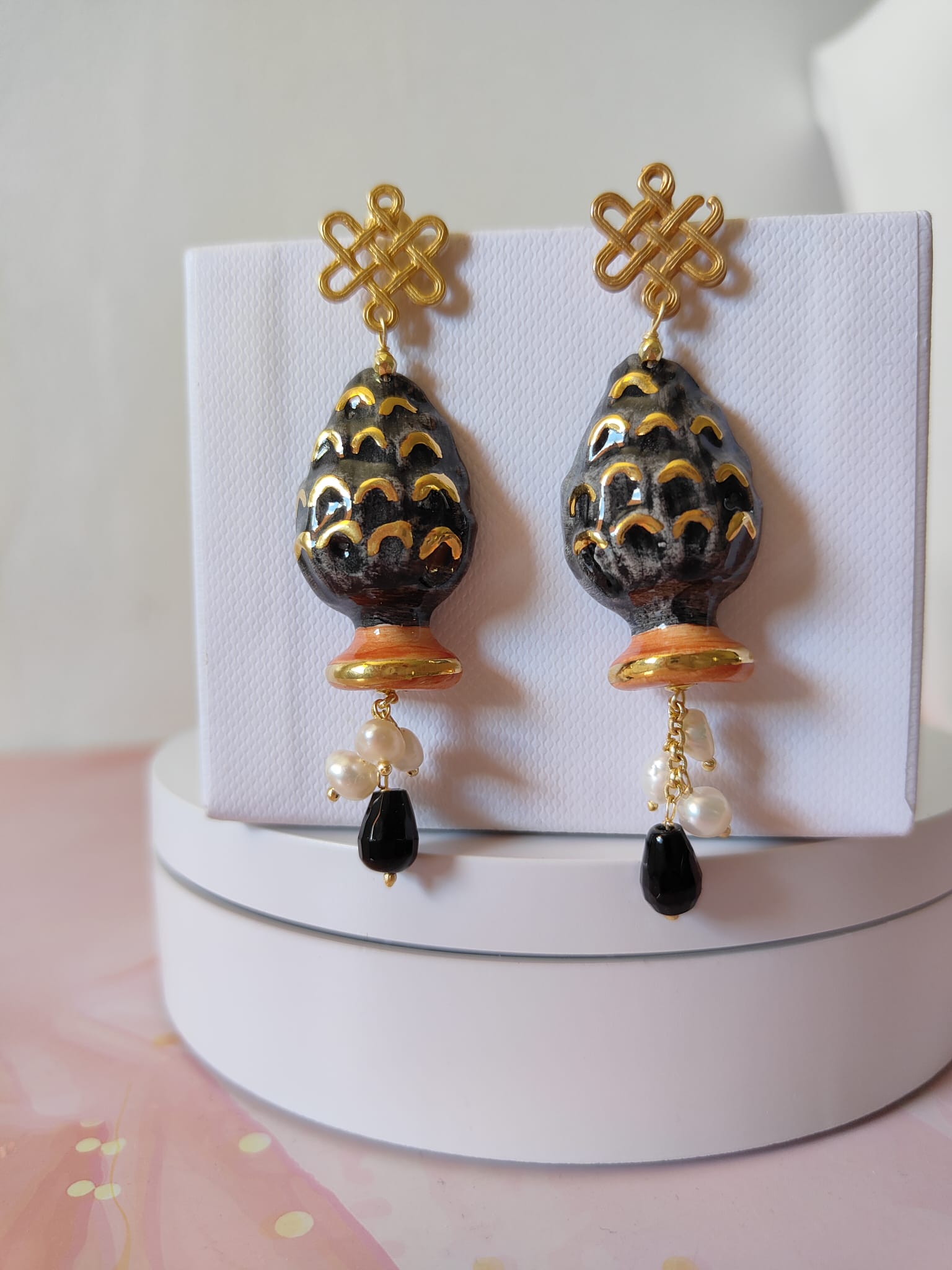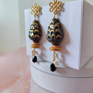 Materiale: ottone dorato, ceramica di Caltagirone, perle naturali, onice nero