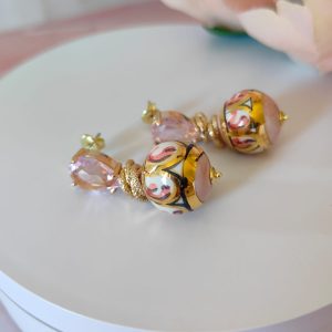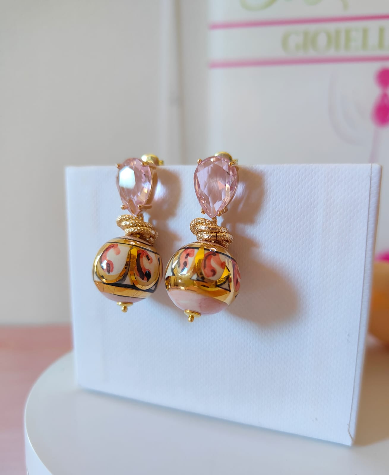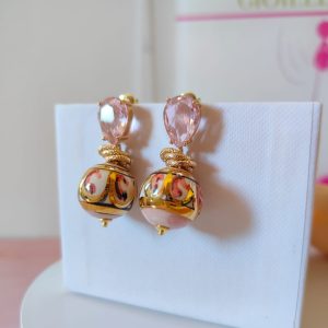 La parte centrale è costituita da una perla in ceramica di Caltagirone dipinta a mano, decorata con motivi floreali stilizzati nei toni del rosa antico, nero e oro su base avorio. La lavorazione artigianale rende ogni perla un pezzo unico, con leggere variazioni che raccontano la bellezza della manifattura tradizionale.