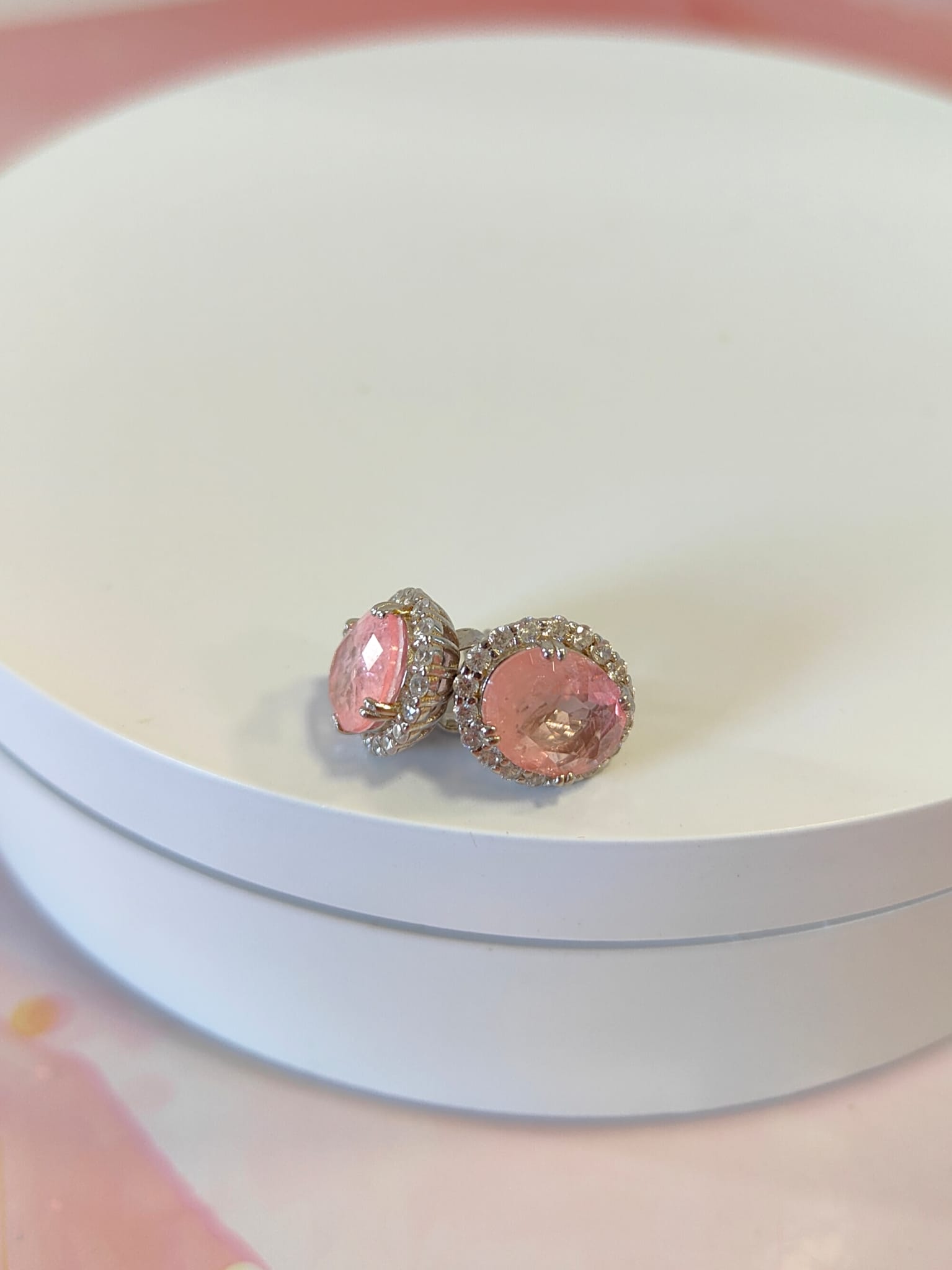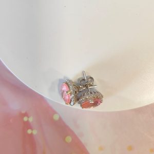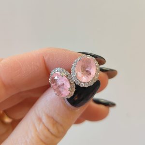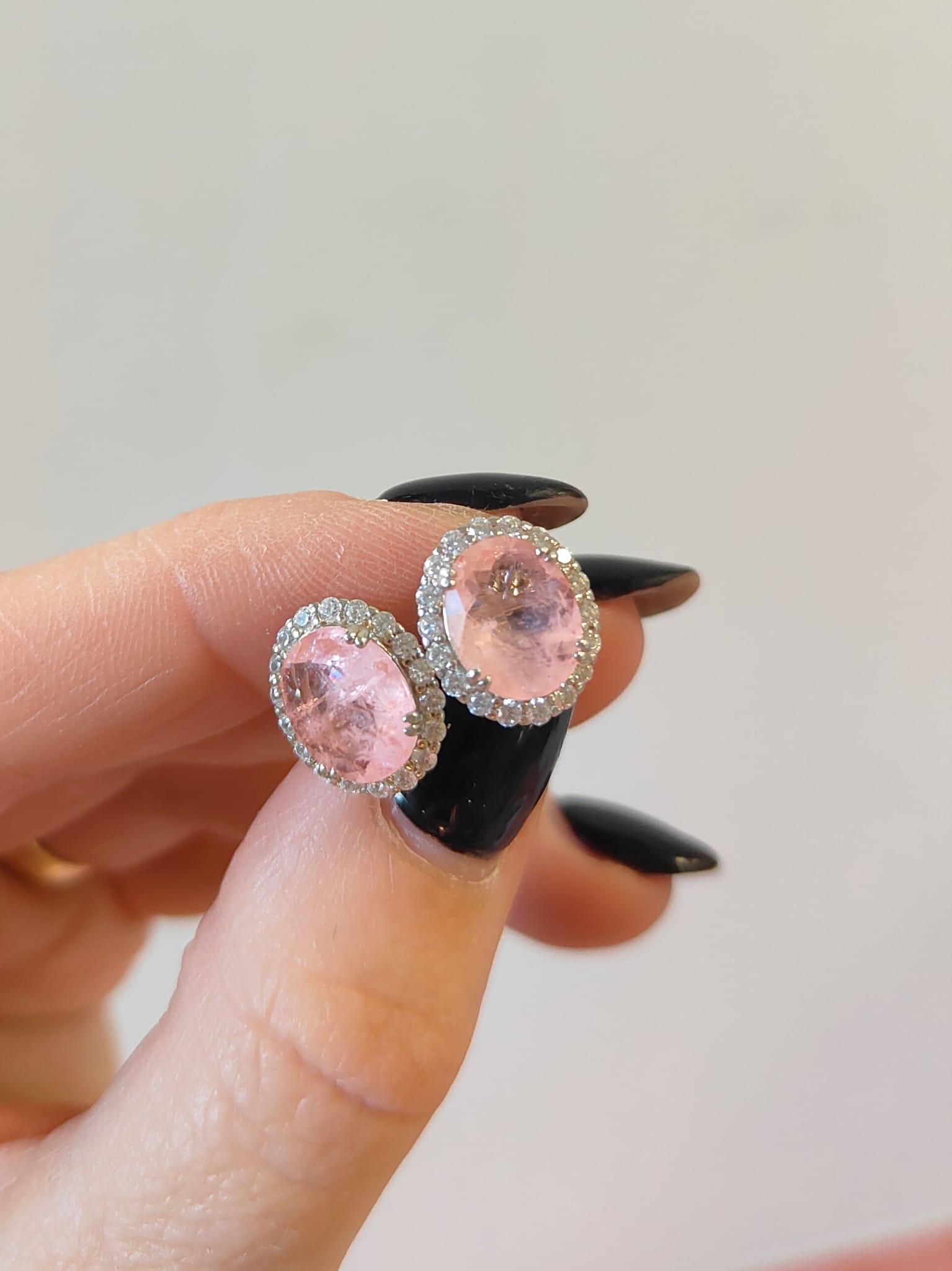 La tonalità rosa delicata della pietra idrotermale richiama sfumature cipria e champagne, rendendoli accessori versatili per outfit primaverili, ma anche per occasioni serali, dove la luce artificiale ne intensifica i riflessi. La montatura bombata sul retro permette alla luce di attraversare la pietra, mentre la lavorazione attorno alla base crea trasparenze e sfaccettature piene di movimento.
