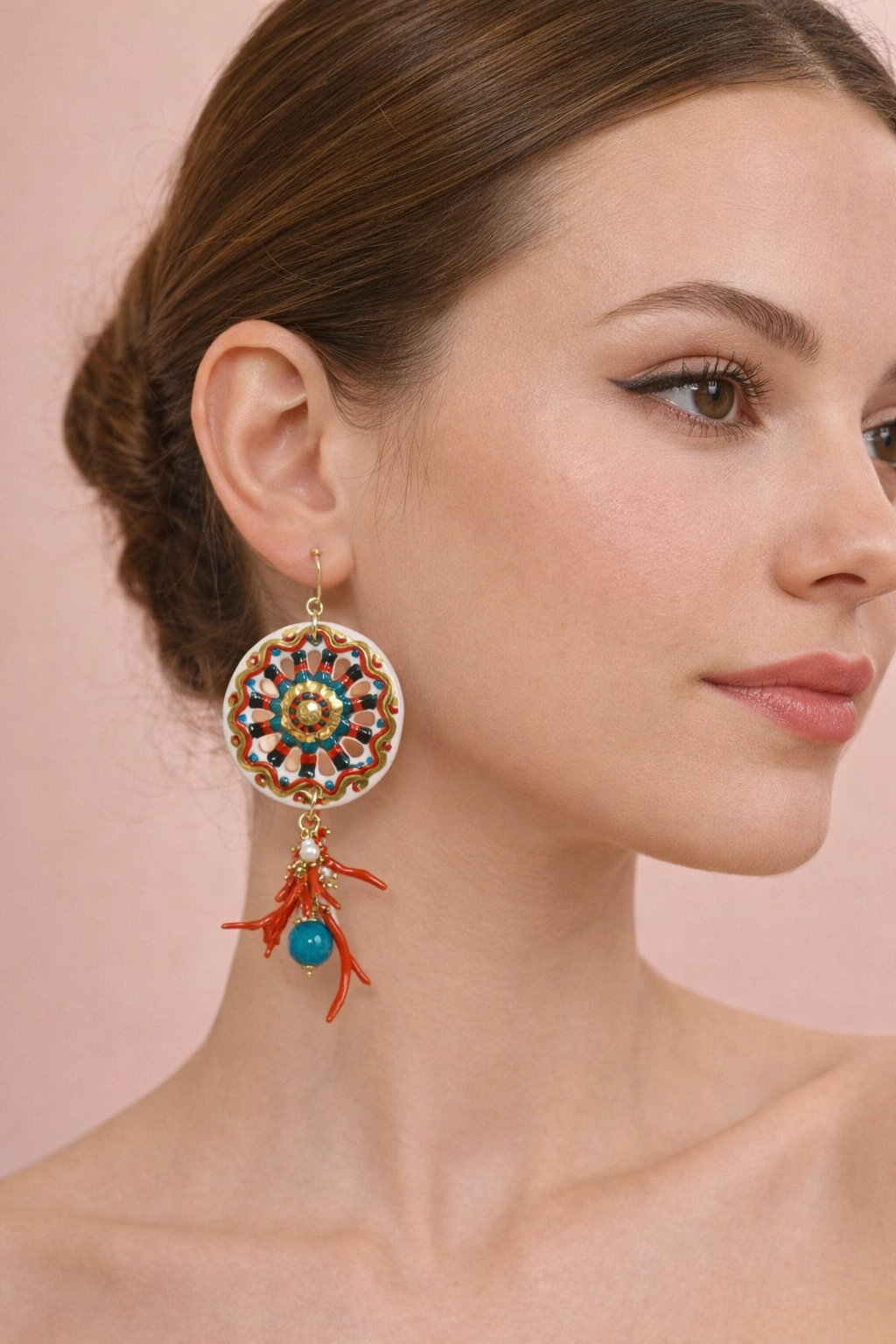Gli orecchini siciliani con corallo e perle celebrano la tradizione artigianale della ceramica di Caltagirone. Il pendente in maiolica dipinta a mano è arricchito da un elegante grappolo con corallo rosso, perle e giada color Tiffany.