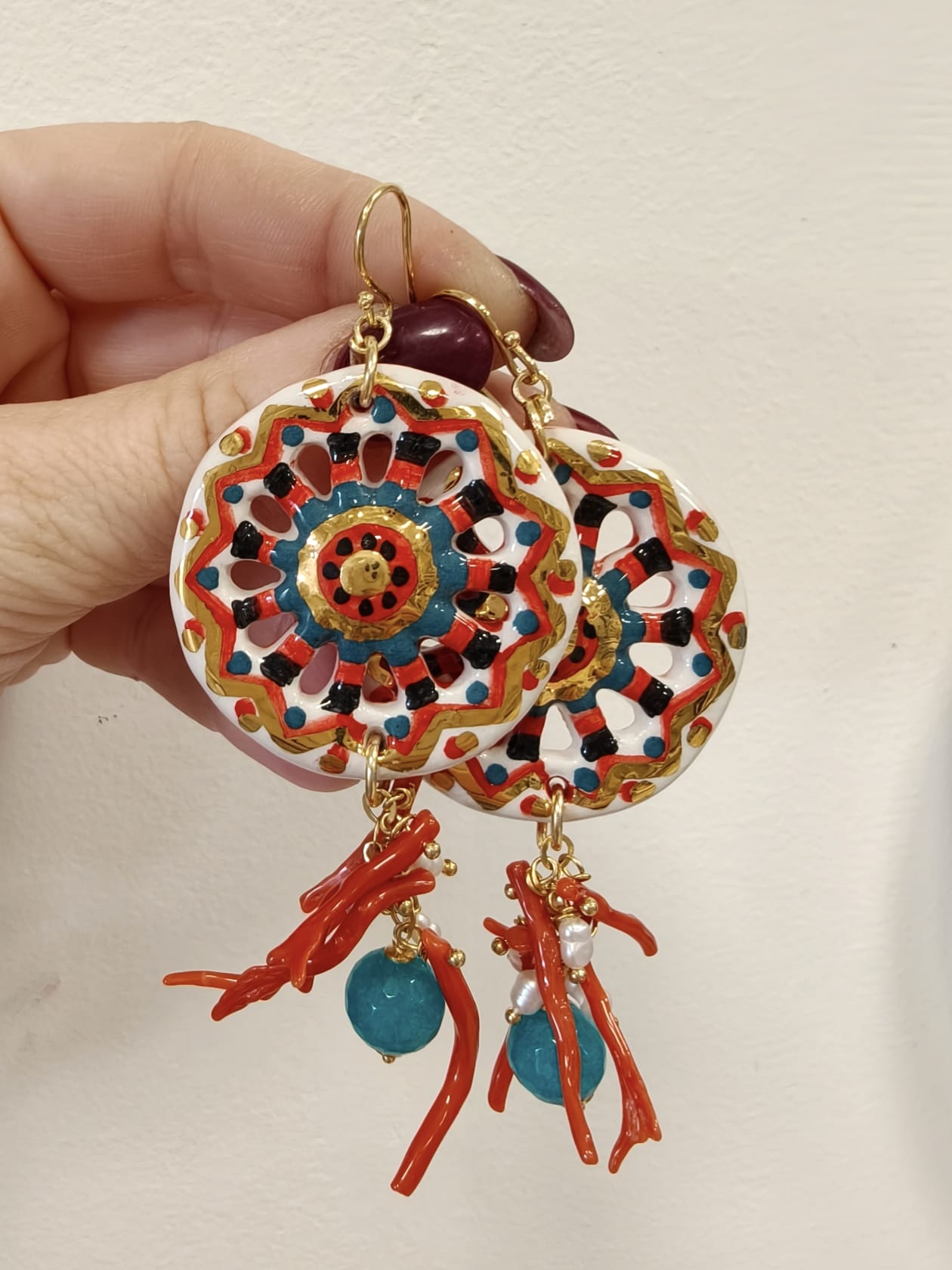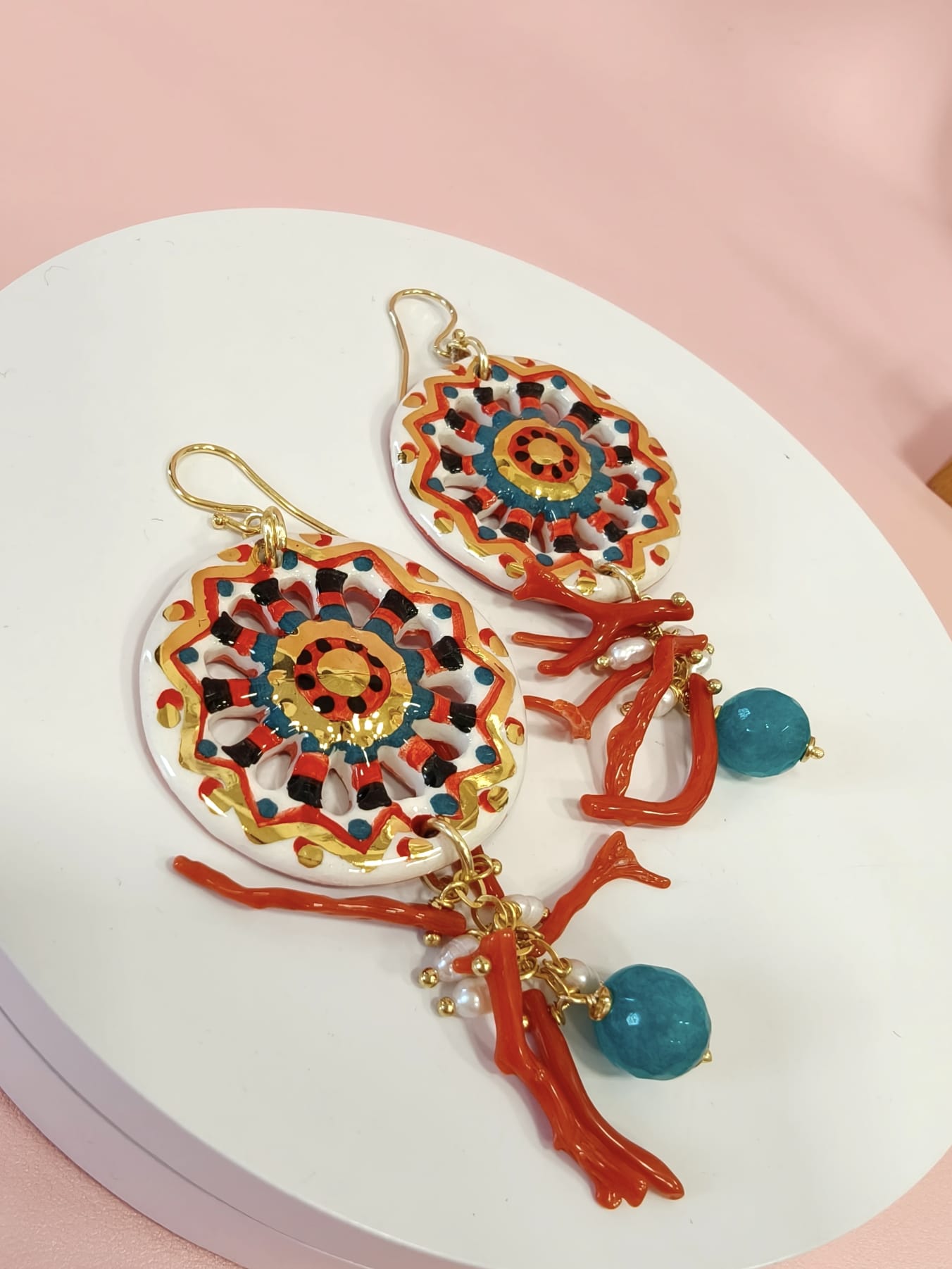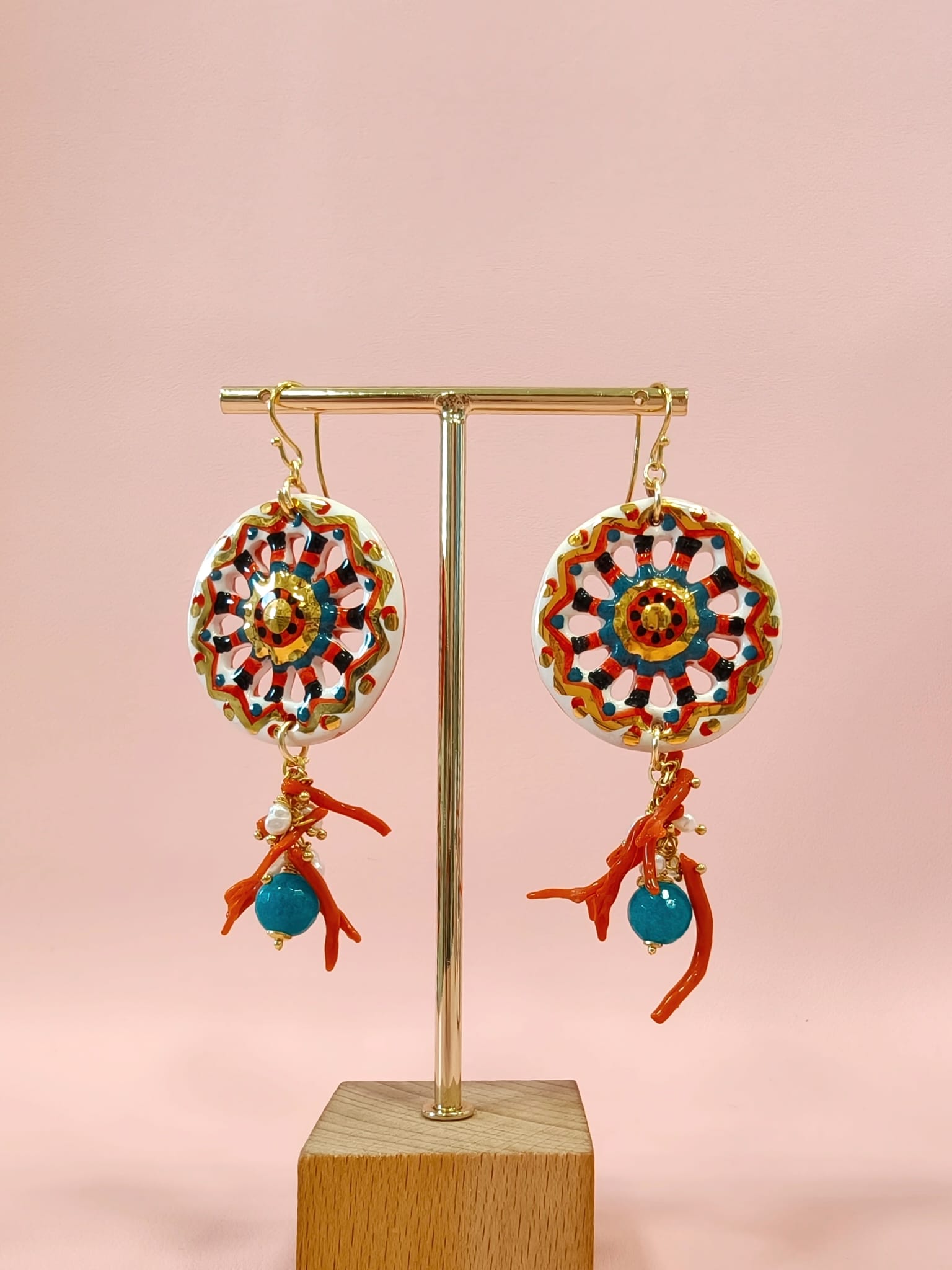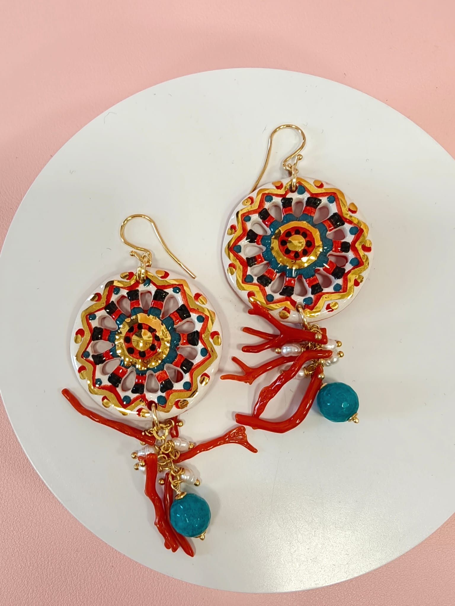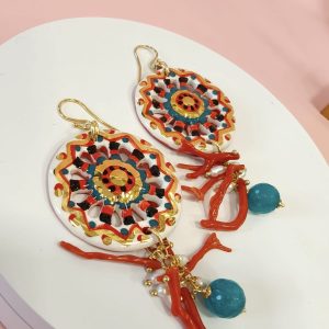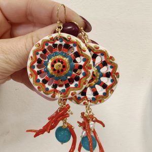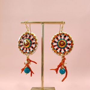 Orecchini Siciliani Con Corallo E Perle Con Ruote In Ceramica