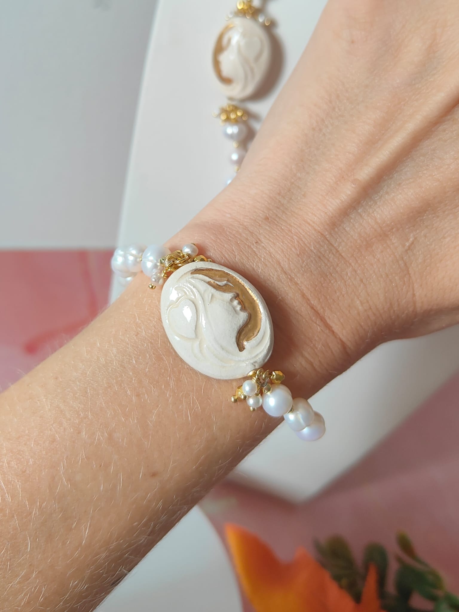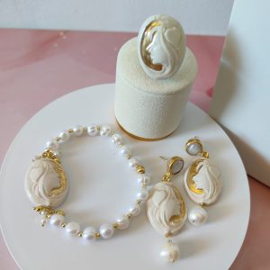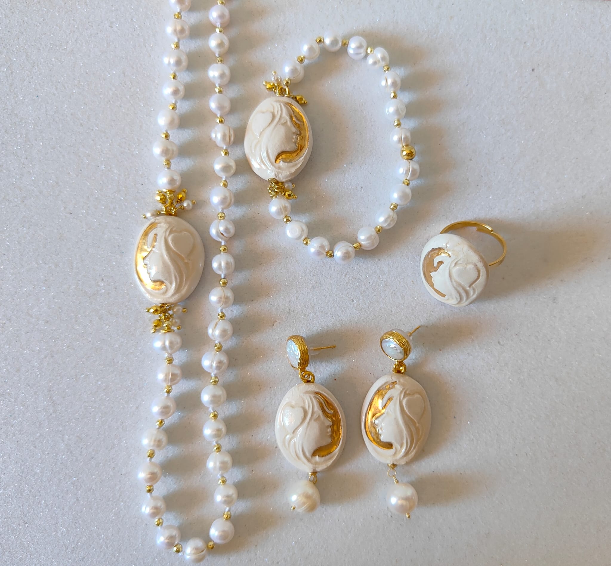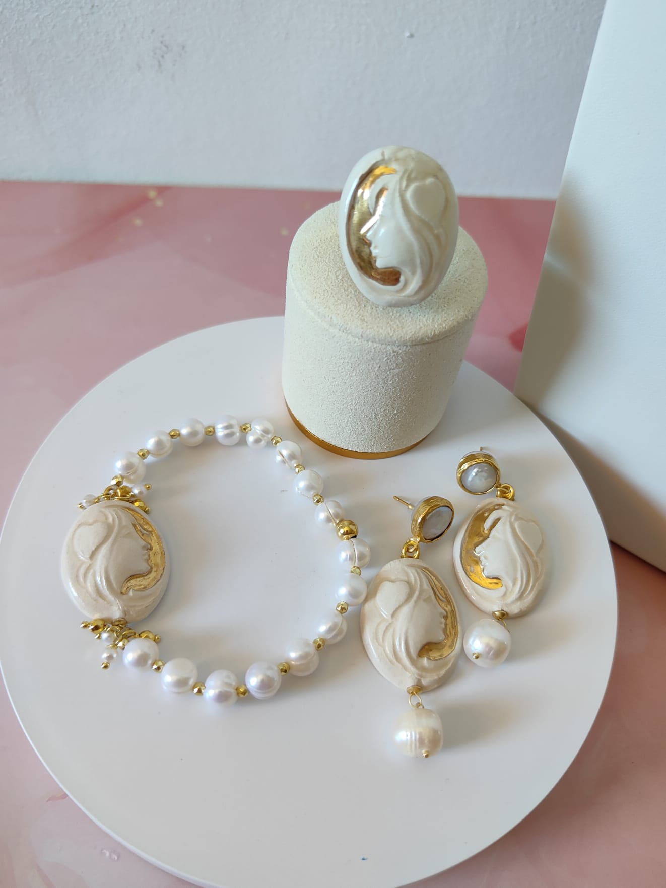 Ogni elemento della parure è stato creato con grande cura artigianale. Il protagonista è il cammeo in ceramica con finitura in oro, che ritrae un delicato profilo femminile in stile classico, impreziosito da inserti in ematite che aggiungono luminosità e profondità al design. Le perle naturali donano al set eleganza senza tempo, creando un dialogo raffinato tra bianco e oro.