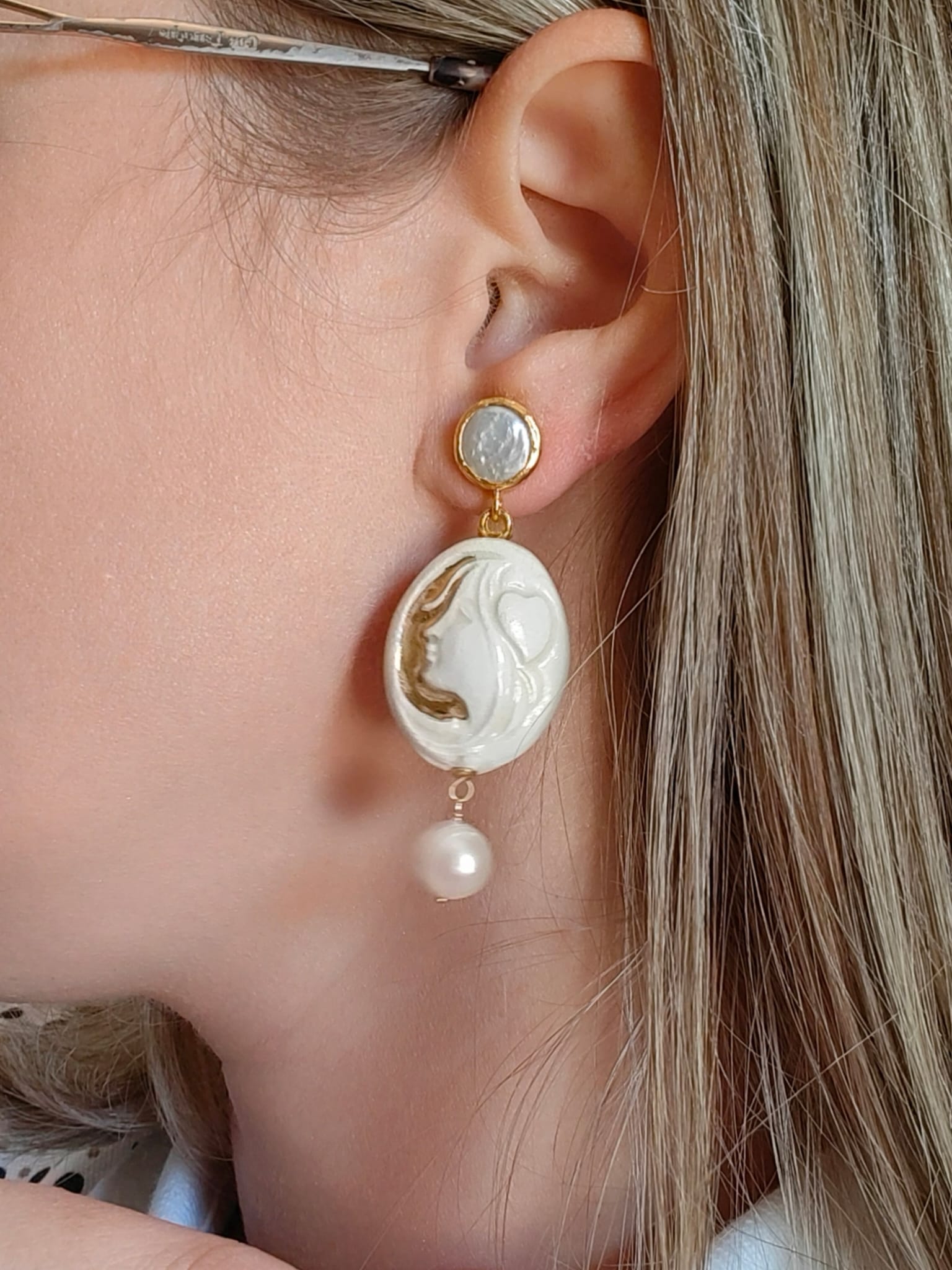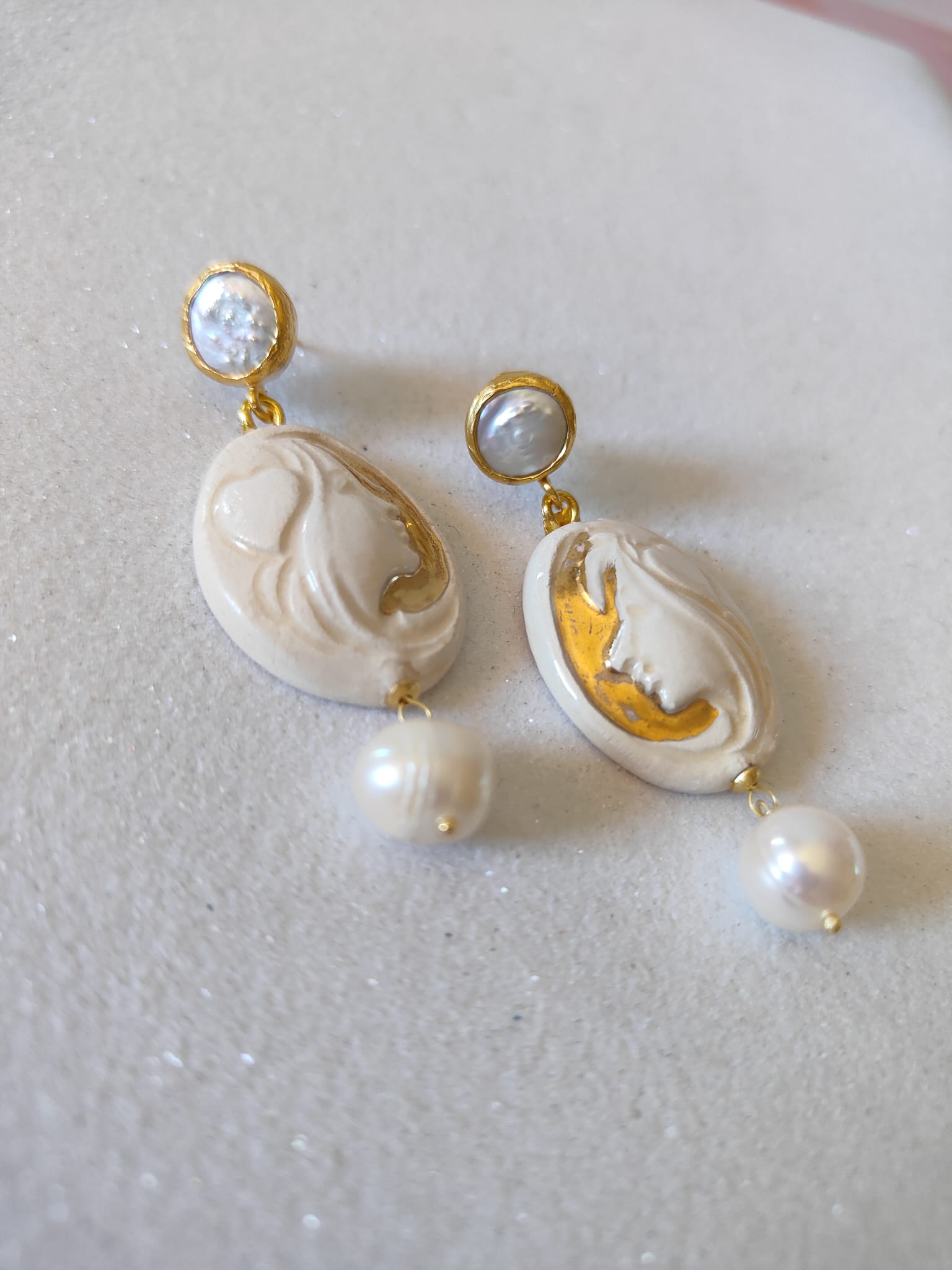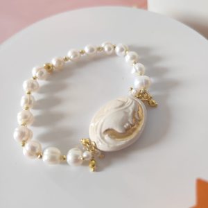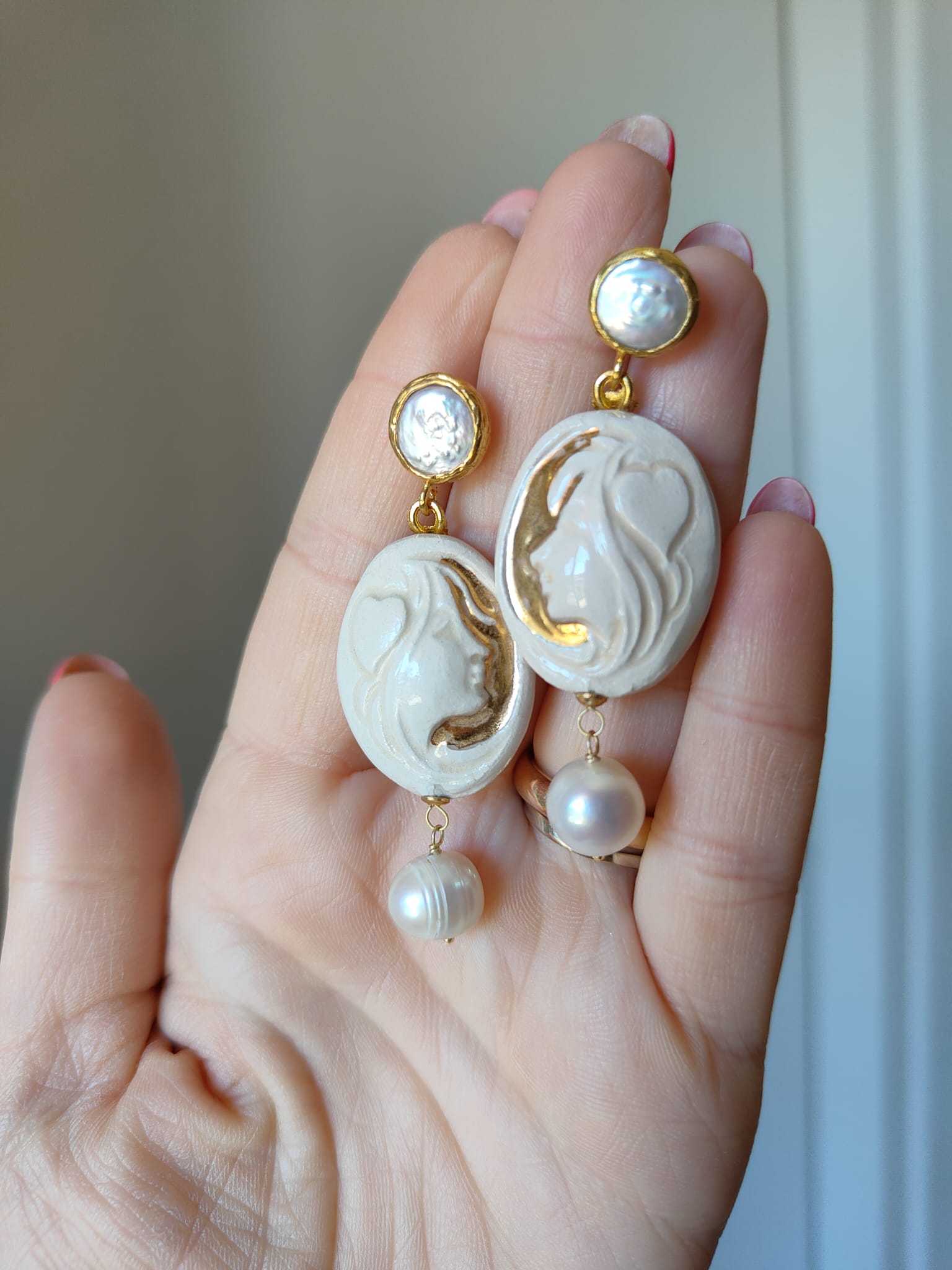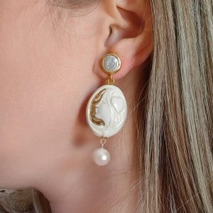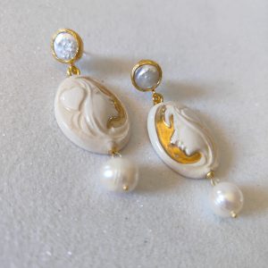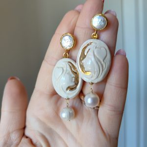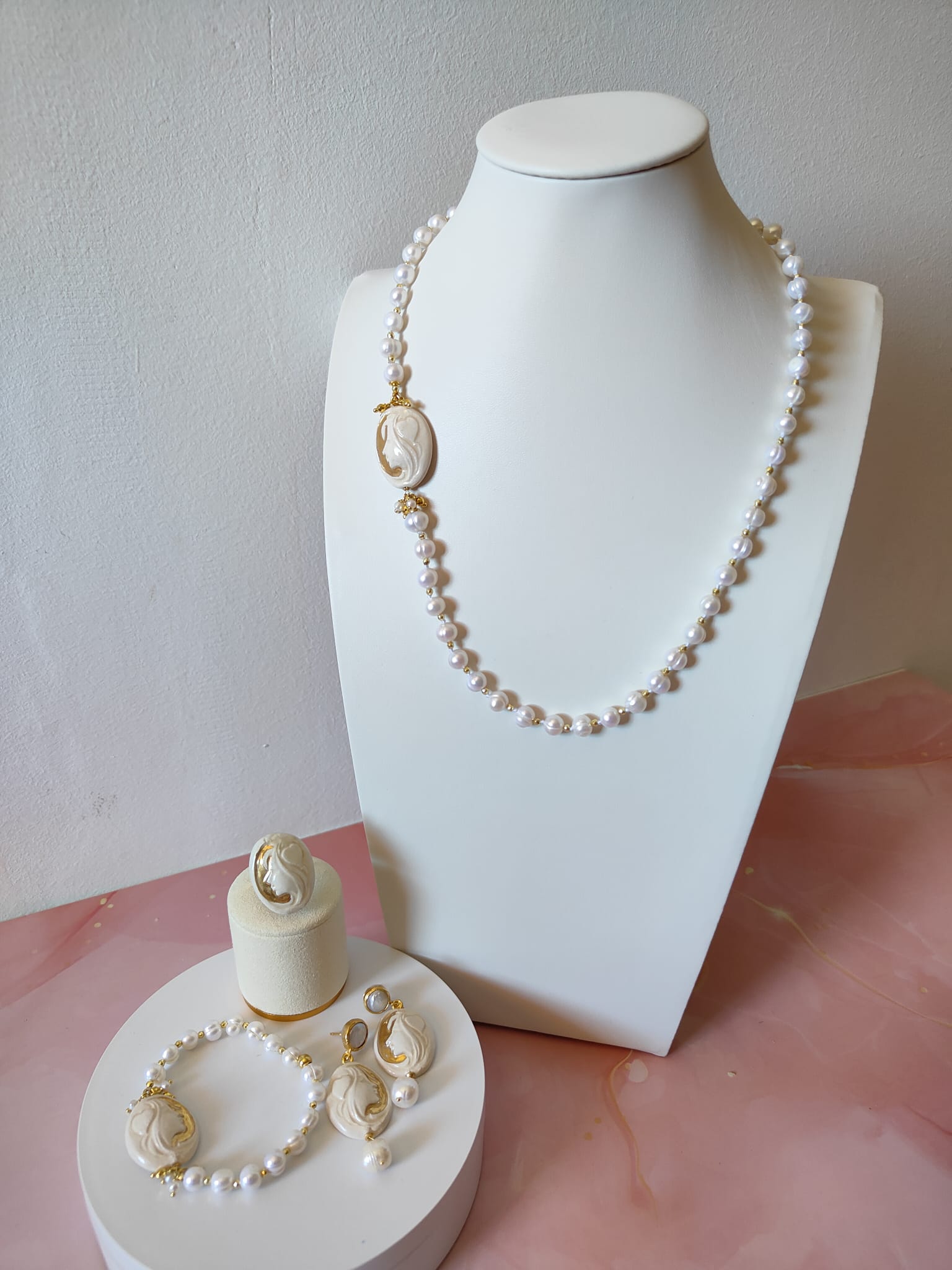 Ogni elemento della parure è stato creato con grande cura artigianale. Il protagonista è il cammeo in ceramica con finitura in oro, che ritrae un delicato profilo femminile in stile classico, impreziosito da inserti in ematite che aggiungono luminosità e profondità al design. Le perle naturali donano al set eleganza senza tempo, creando un dialogo raffinato tra bianco e oro.