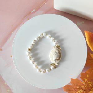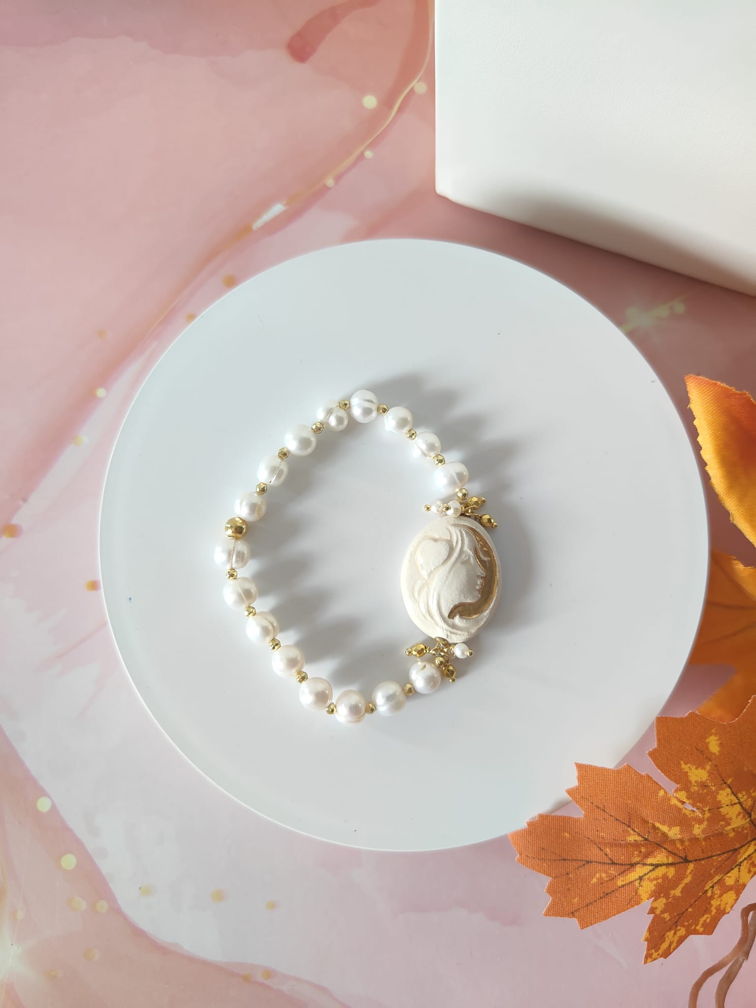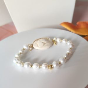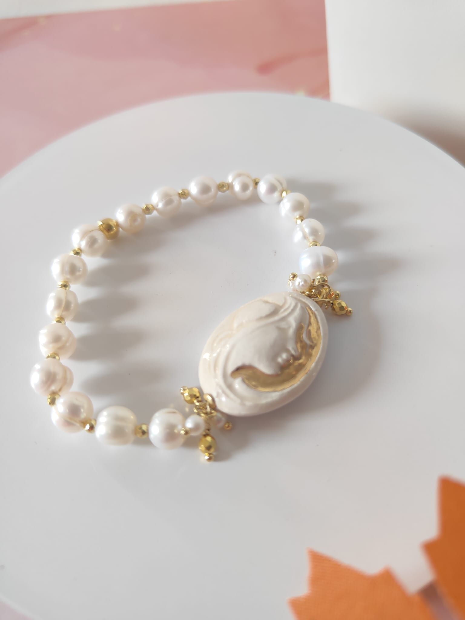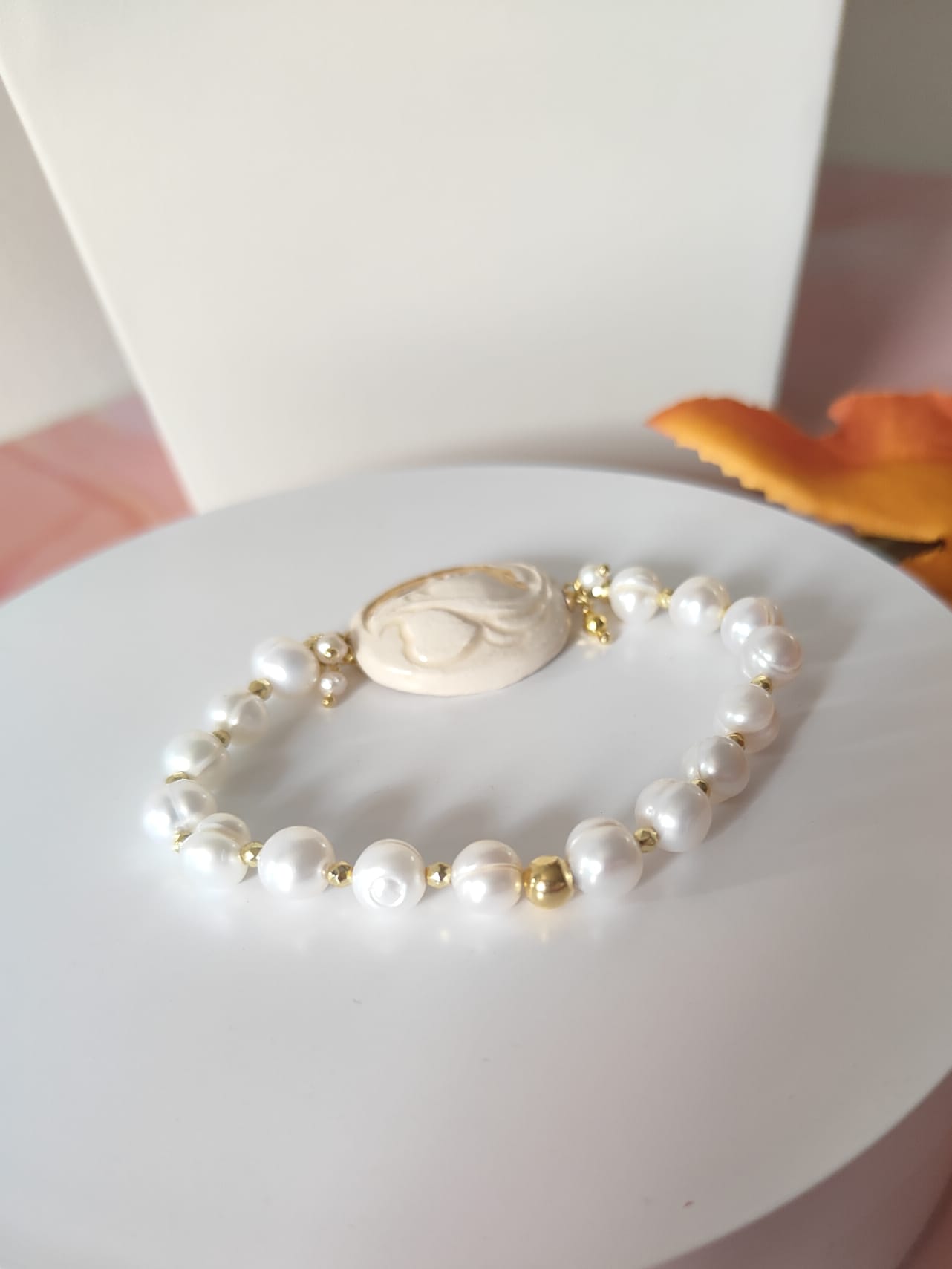 Ogni elemento della parure è stato creato con grande cura artigianale. Il protagonista è il cammeo in ceramica con finitura in oro, che ritrae un delicato profilo femminile in stile classico, impreziosito da inserti in ematite che aggiungono luminosità e profondità al design. Le perle naturali donano al set eleganza senza tempo, creando un dialogo raffinato tra bianco e oro.
