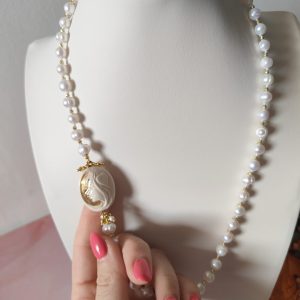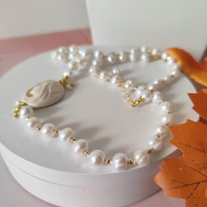 La collana è montata con perle intervallate da dettagli dorati e presenta una chiusura in argento 925 placcato oro, che unisce qualità e bellezza. Il bracciale elastico, comodo e adattabile, riprende lo stesso motivo con perle e cammeo centrale. Gli orecchini hanno perno in ottone e si completano con una perla pendente che dona movimento e grazia. L’anello, regolabile, porta il cammeo in evidenza, per un look deciso e originale.