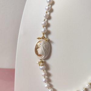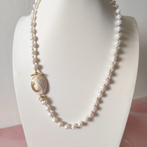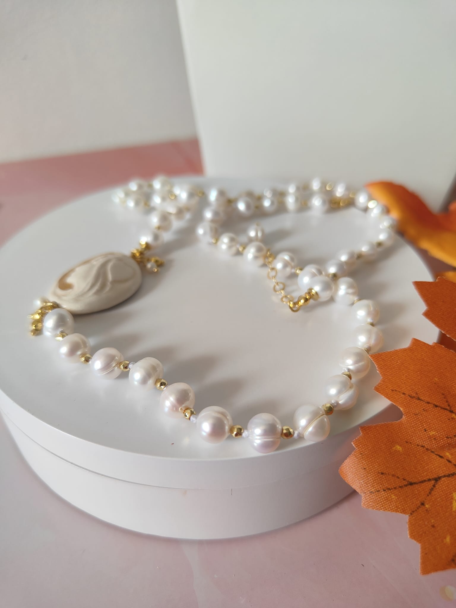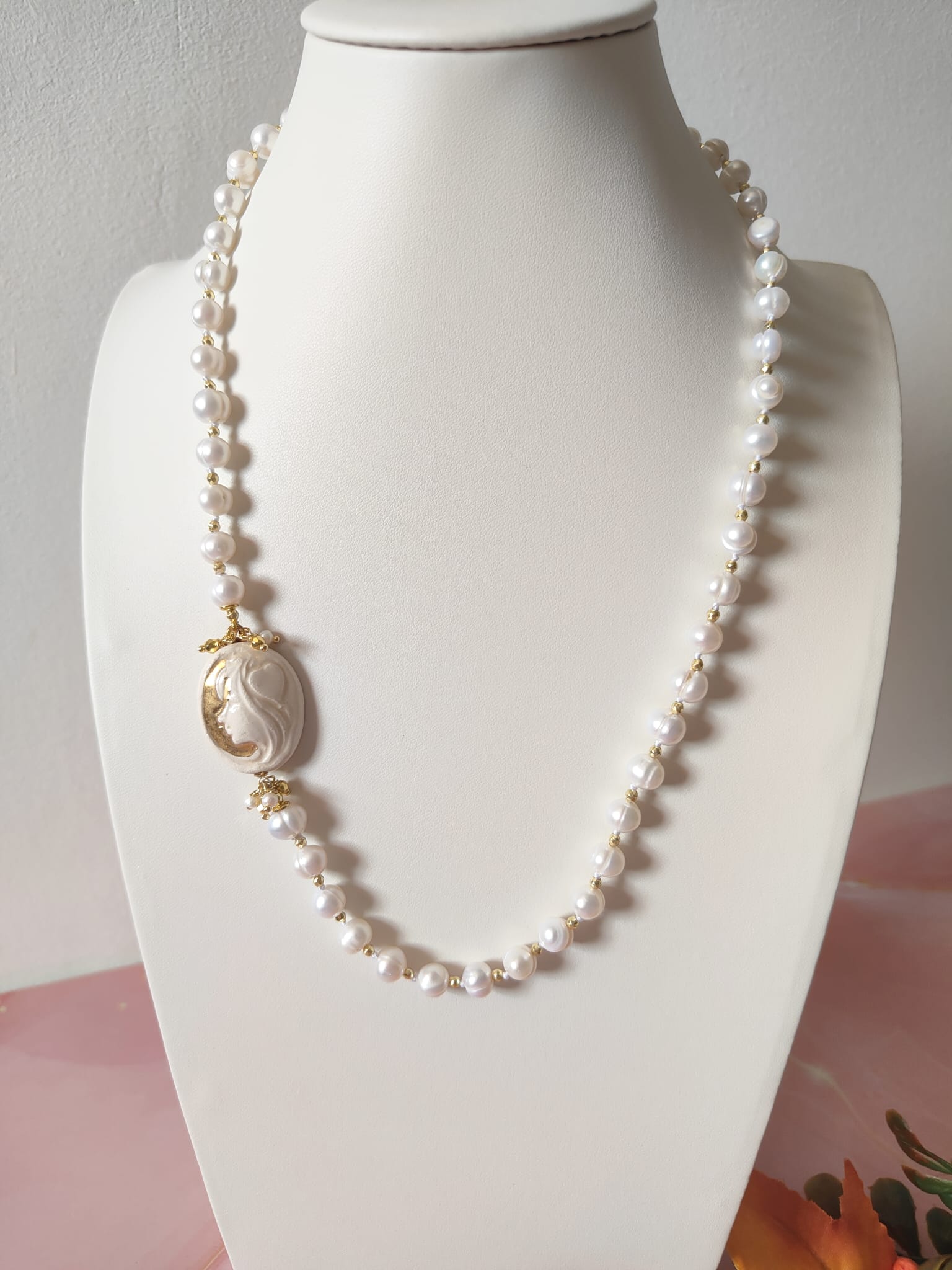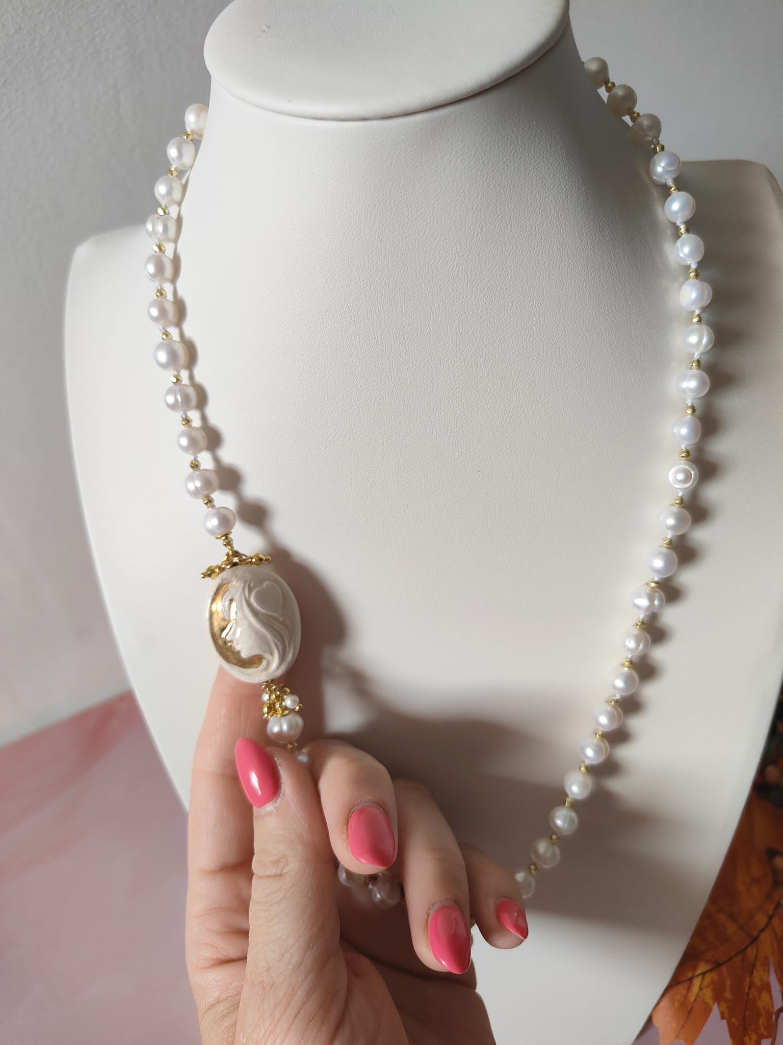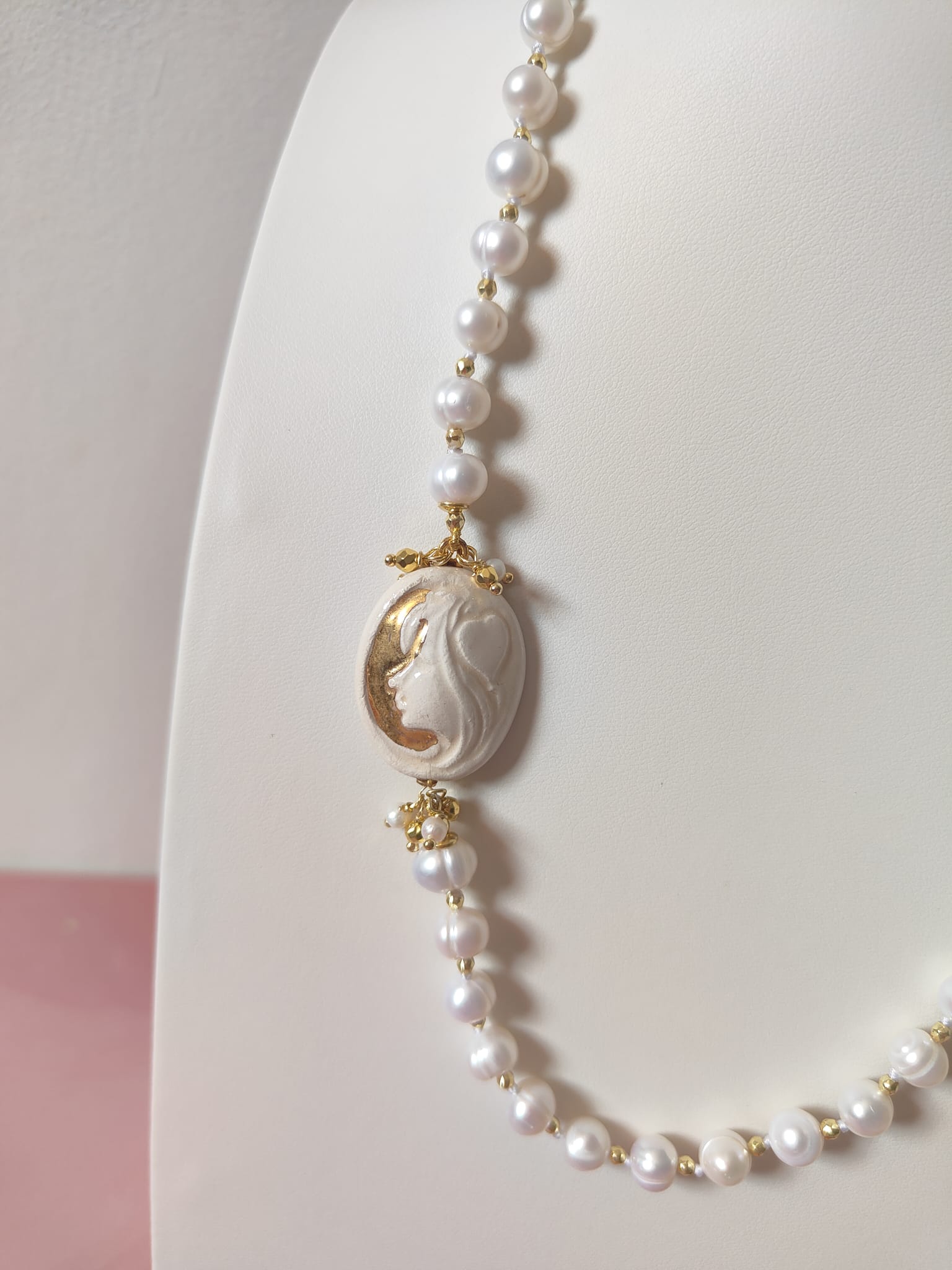 Collana: perle e cammeo in ceramica, chiusura in argento 925 placcato oro Lunga 55 cm + prolungamento