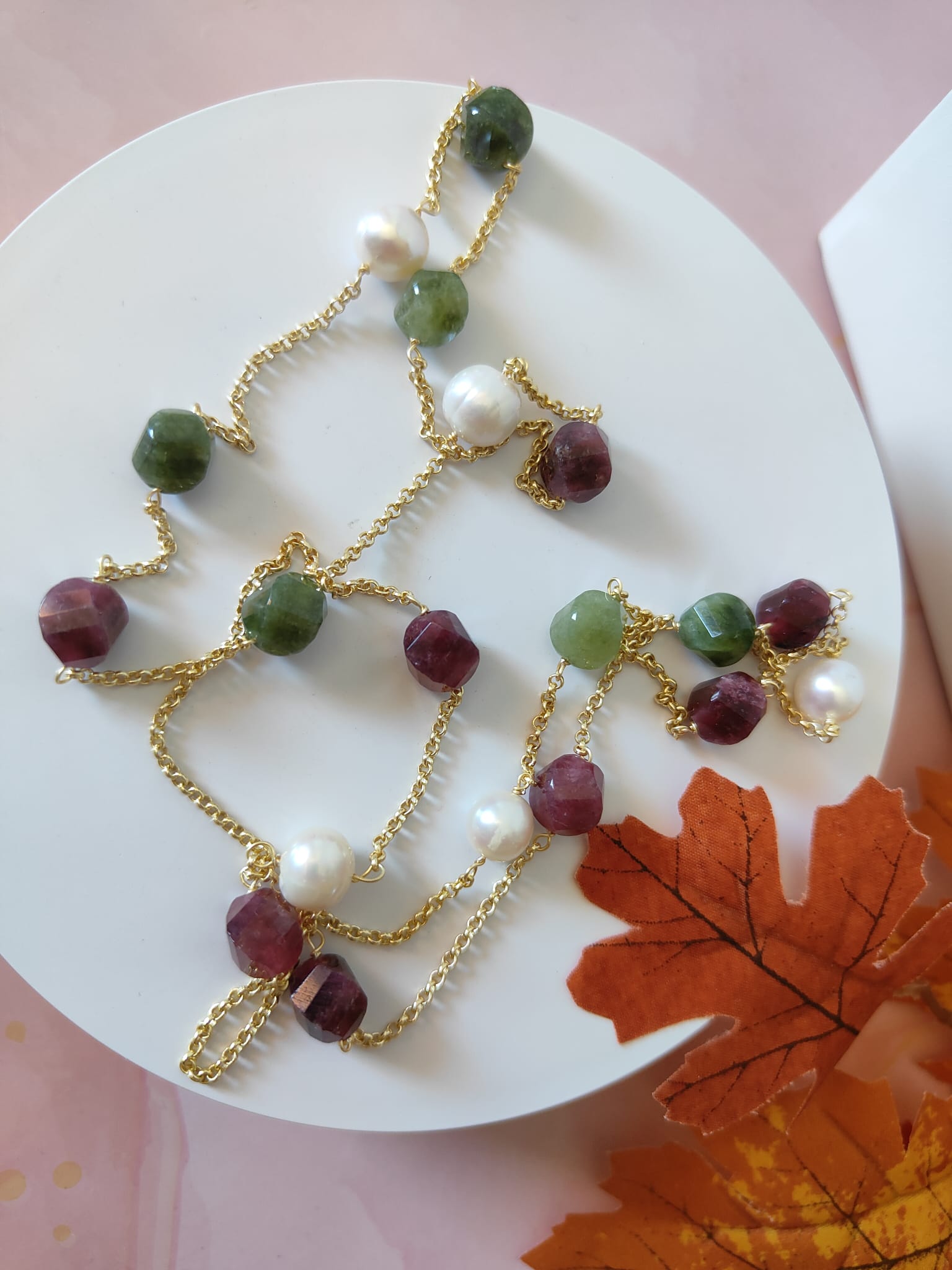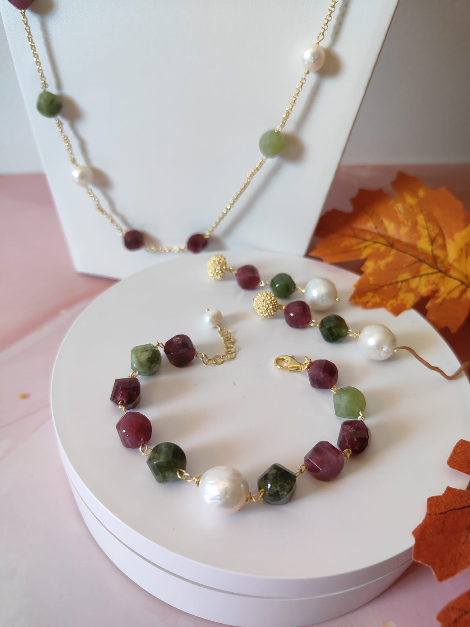 La parure granato perle e zoisite con catenina dorata è un insieme elegante e ricercato, realizzato come unico esemplare per chi desidera un gioiello irripetibile. Questa creazione comprende tre pezzi coordinati: una collana lunga senza chiusura, un bracciale regolabile e un paio di orecchini pendenti, tutti impreziositi da pietre naturali e perle barocche selezionate.