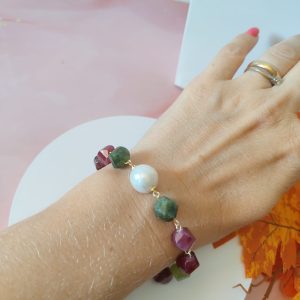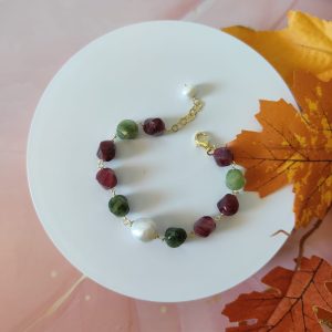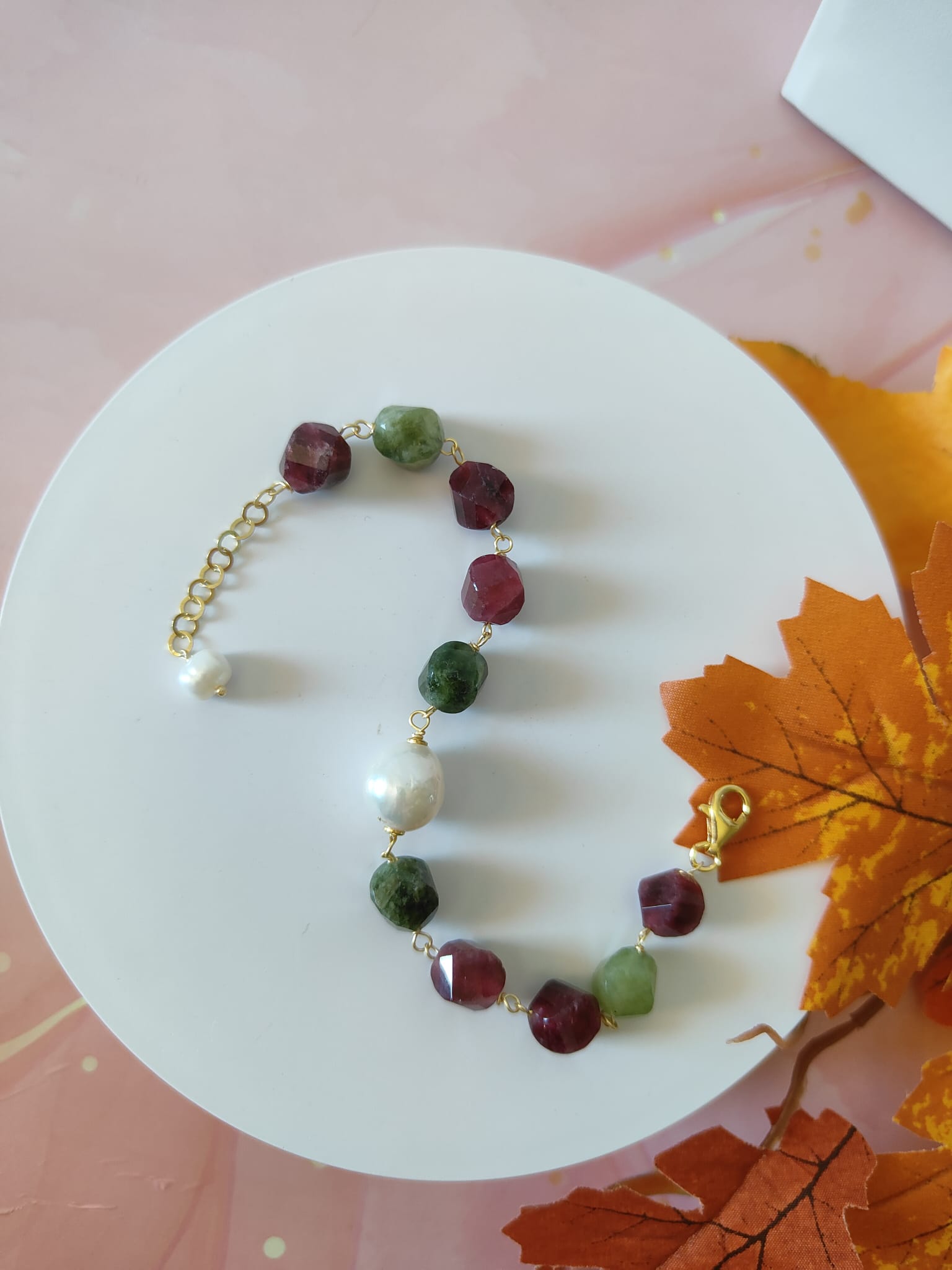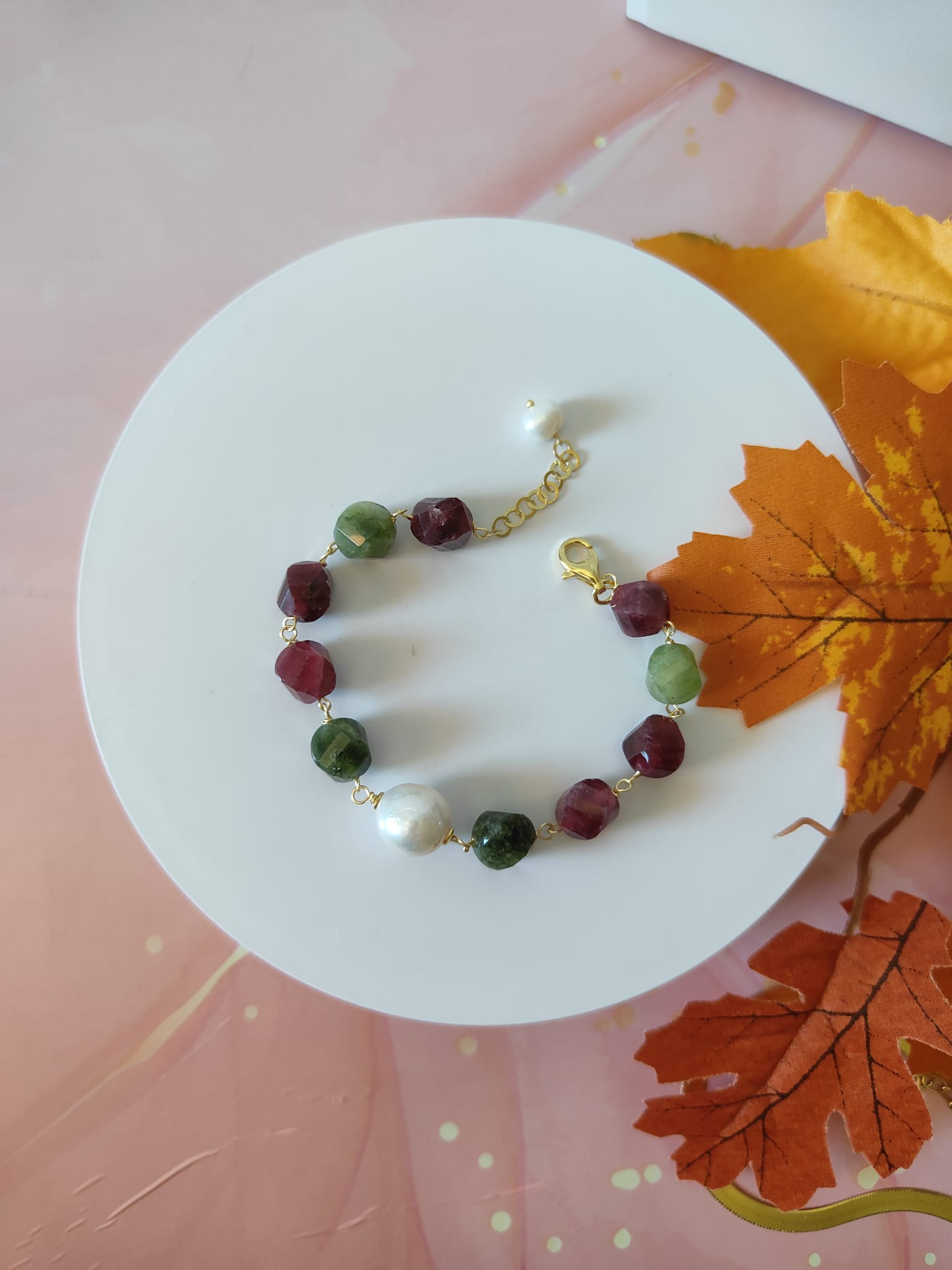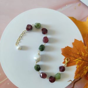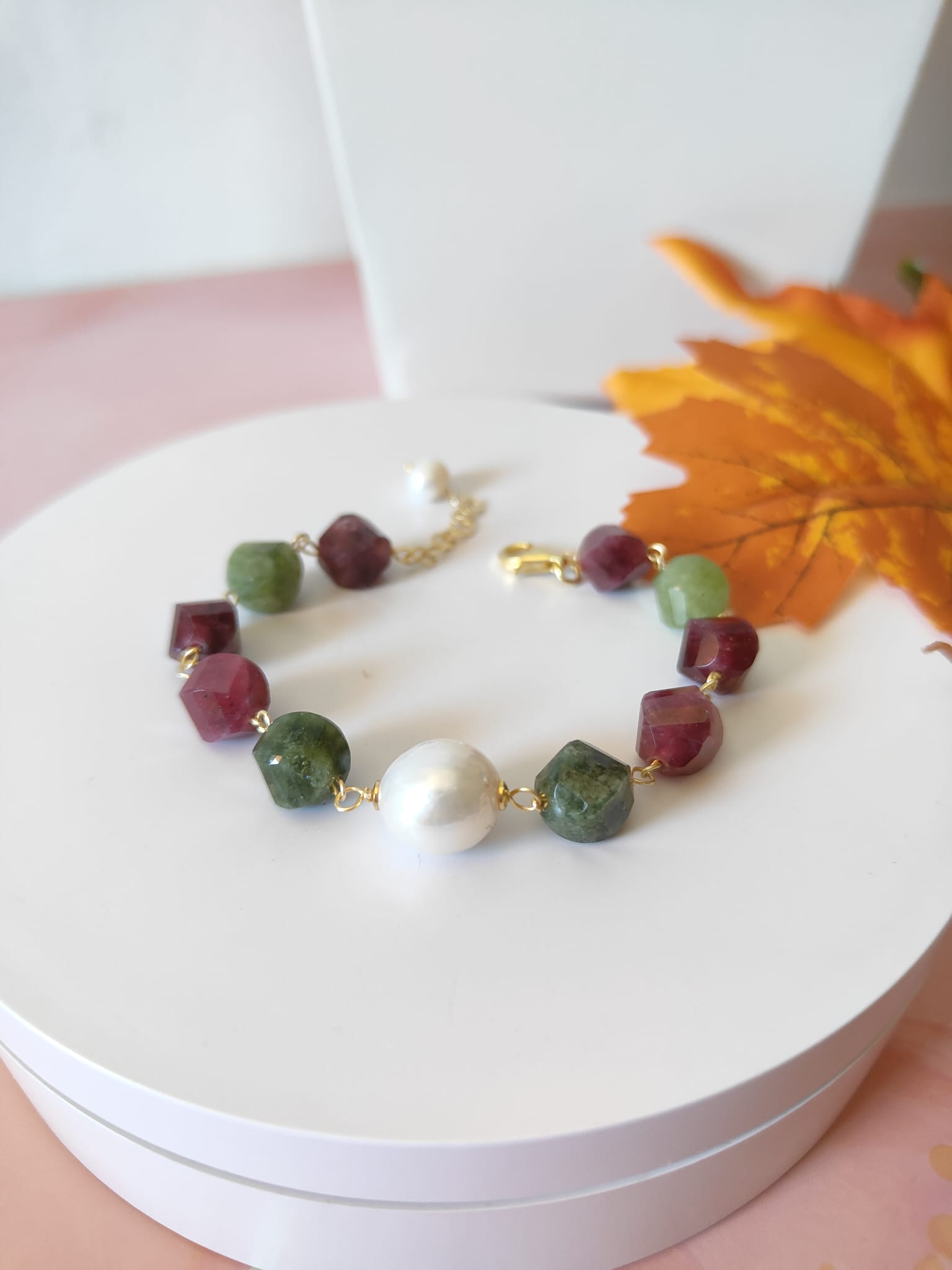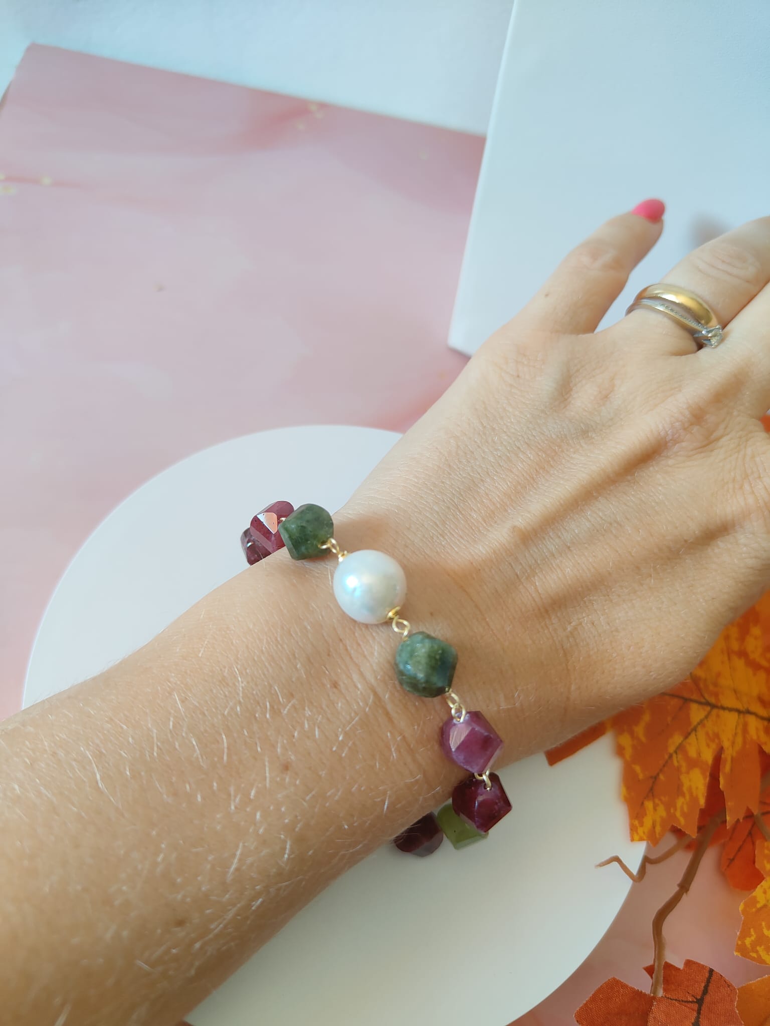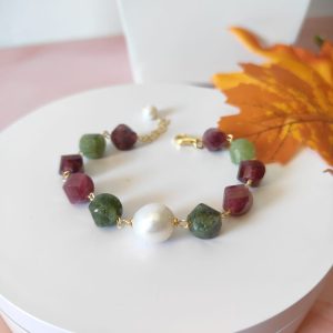 Il bracciale esalta la bellezza delle pietre con una perla centrale incorniciata da granato e zoisite. Montato con chiusura in argento 925 placcato oro, è regolabile e confortevole, ideale per adattarsi a diversi polsi.