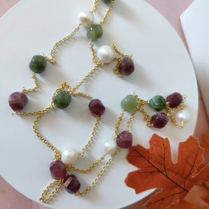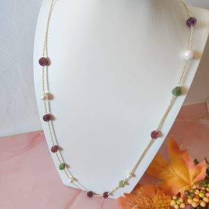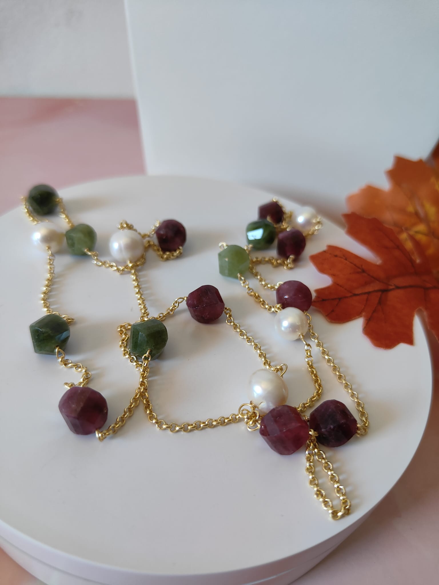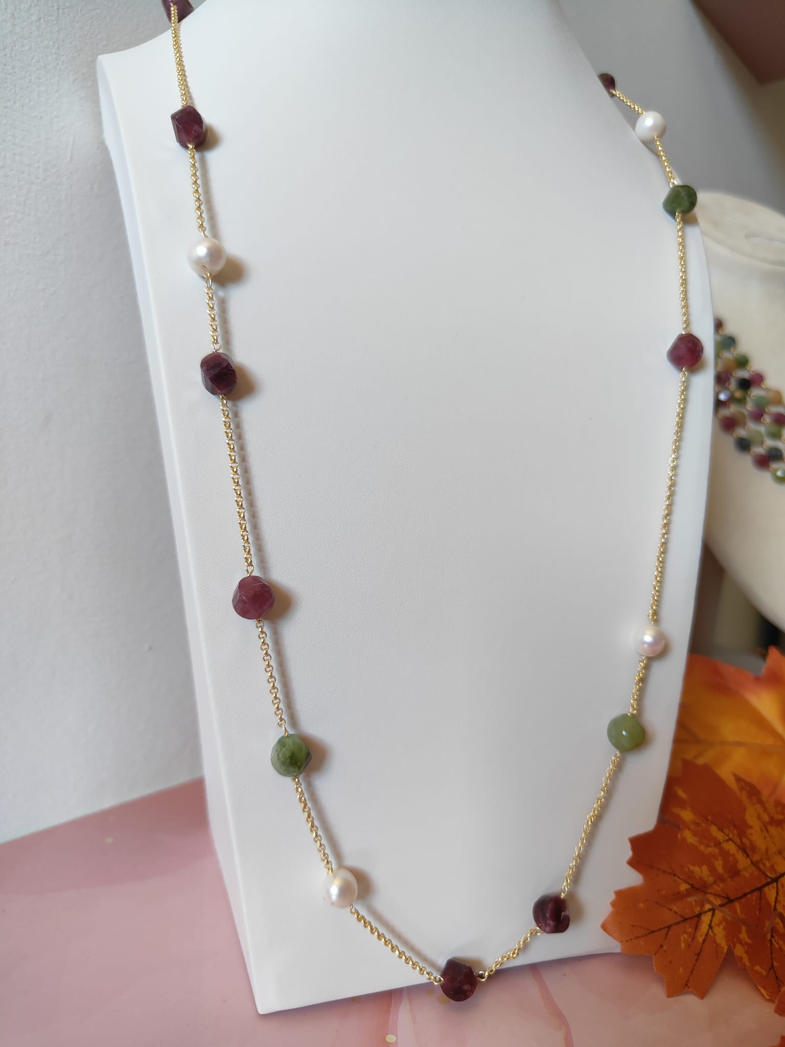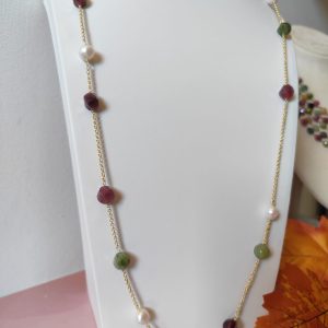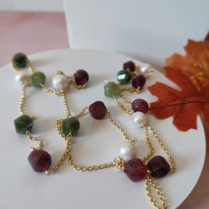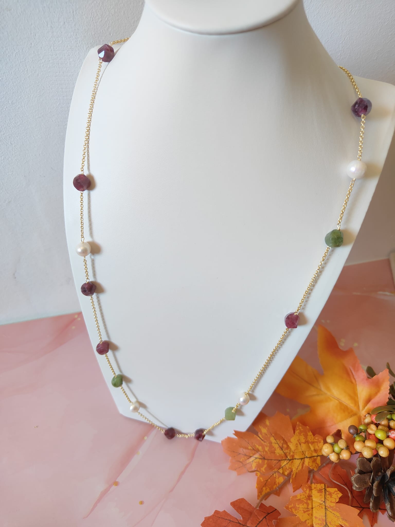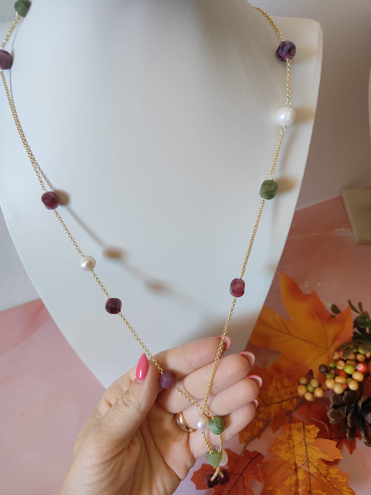 La collana, dal design fluido e senza chiusura, è caratterizzata da una catenina dorata che alterna perle naturali barocche, granato rosso sfaccettato e pietra verde zoisite, creando un contrasto raffinato e armonioso. La sua lunghezza la rende versatile, perfetta per essere indossata sia singolarmente sia abbinata ad altri gioielli.