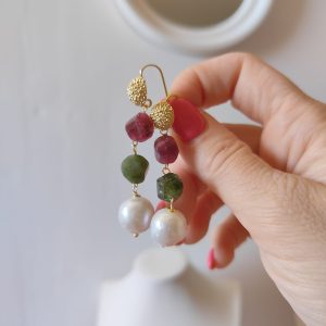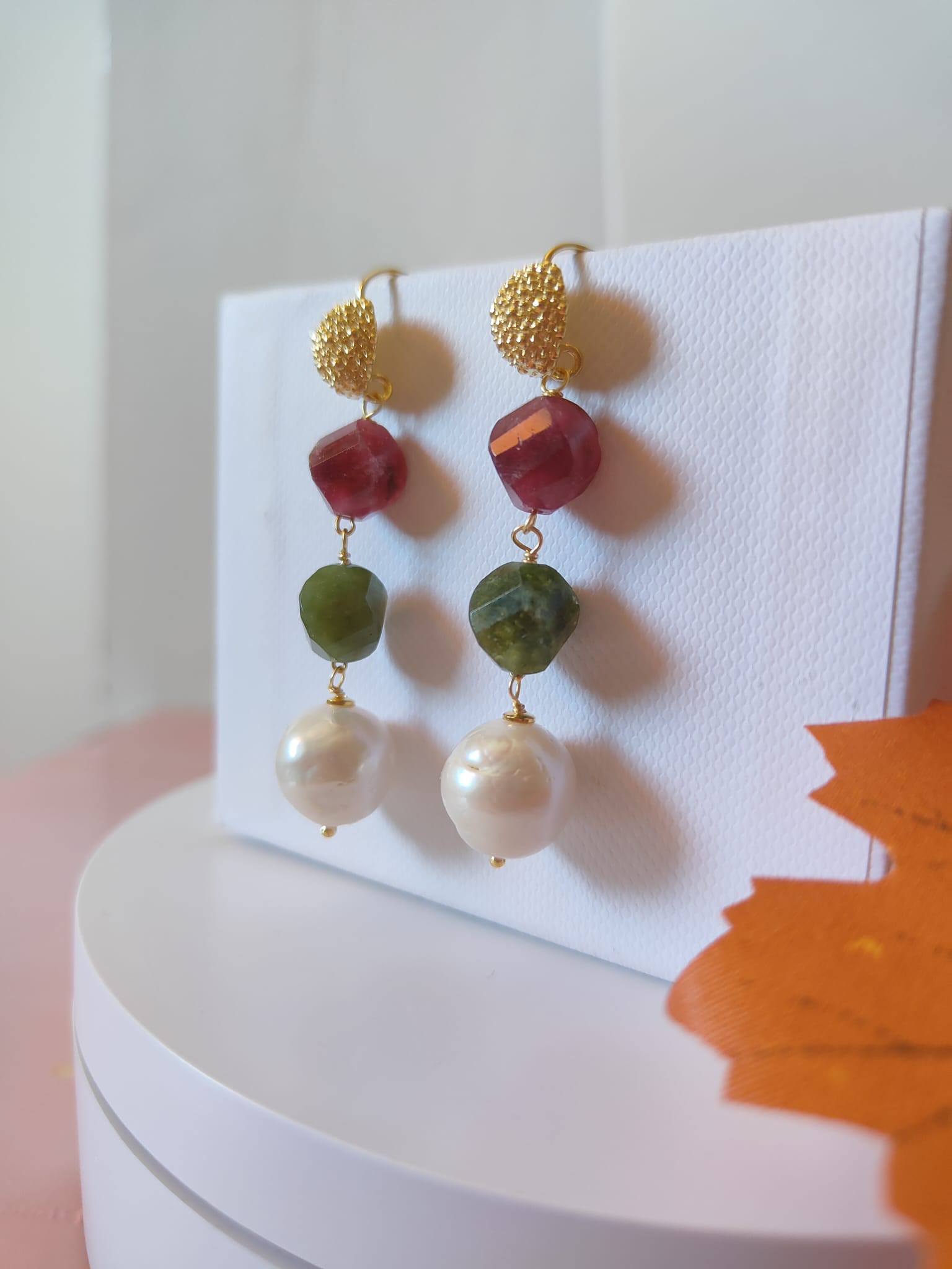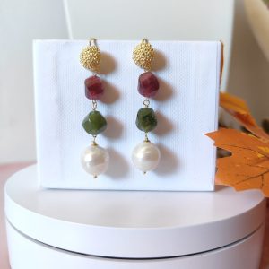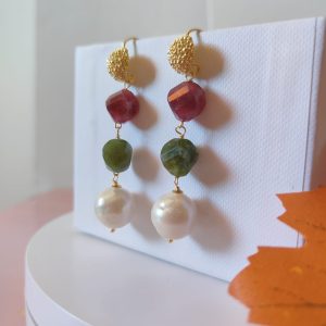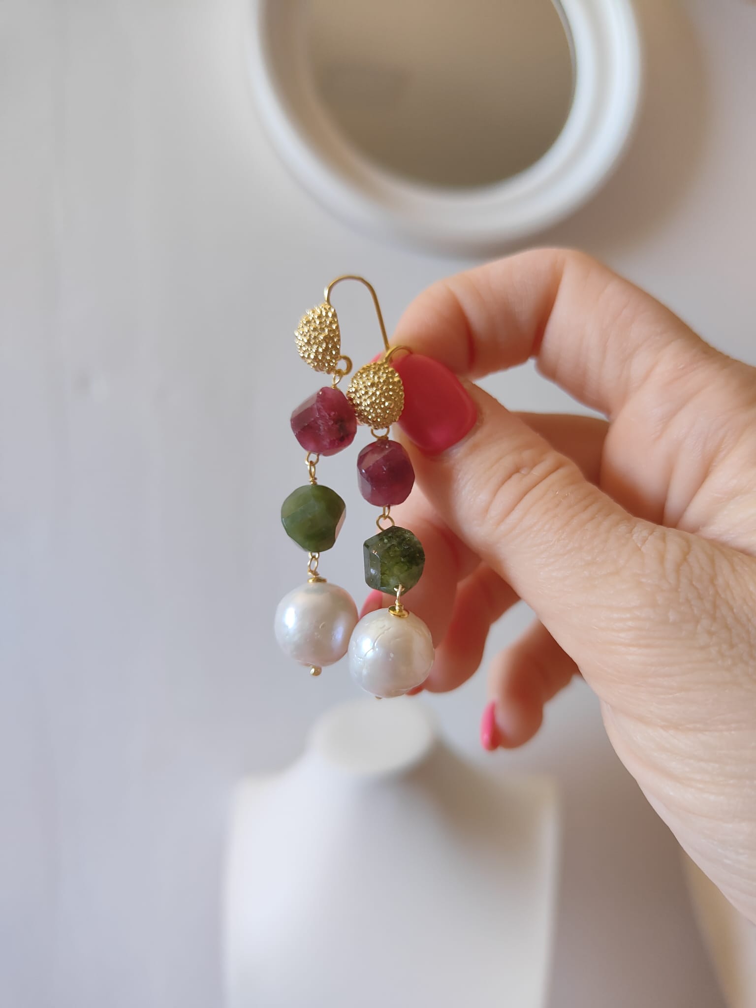 Gli orecchini, dal design elegante, uniscono la brillantezza del granato e la naturalezza della zoisite alla luminosità delle perle barocche. Leggeri e raffinati, sono montati con monachella in argento 925 placcato oro per garantire qualità e comfort.