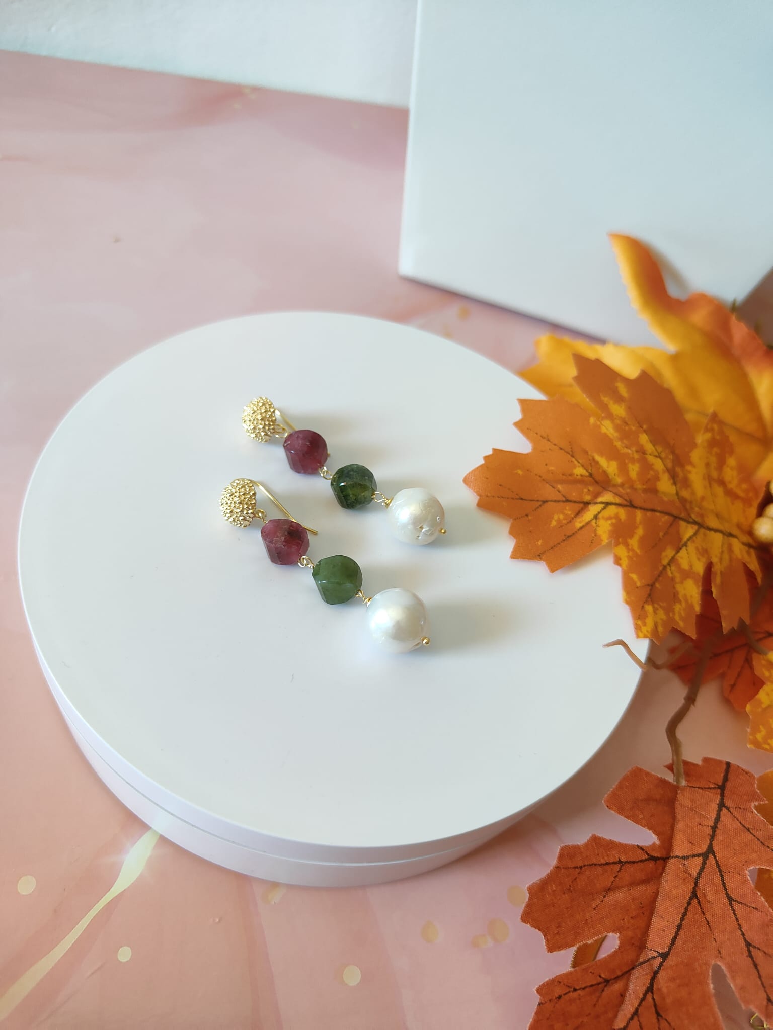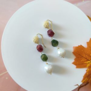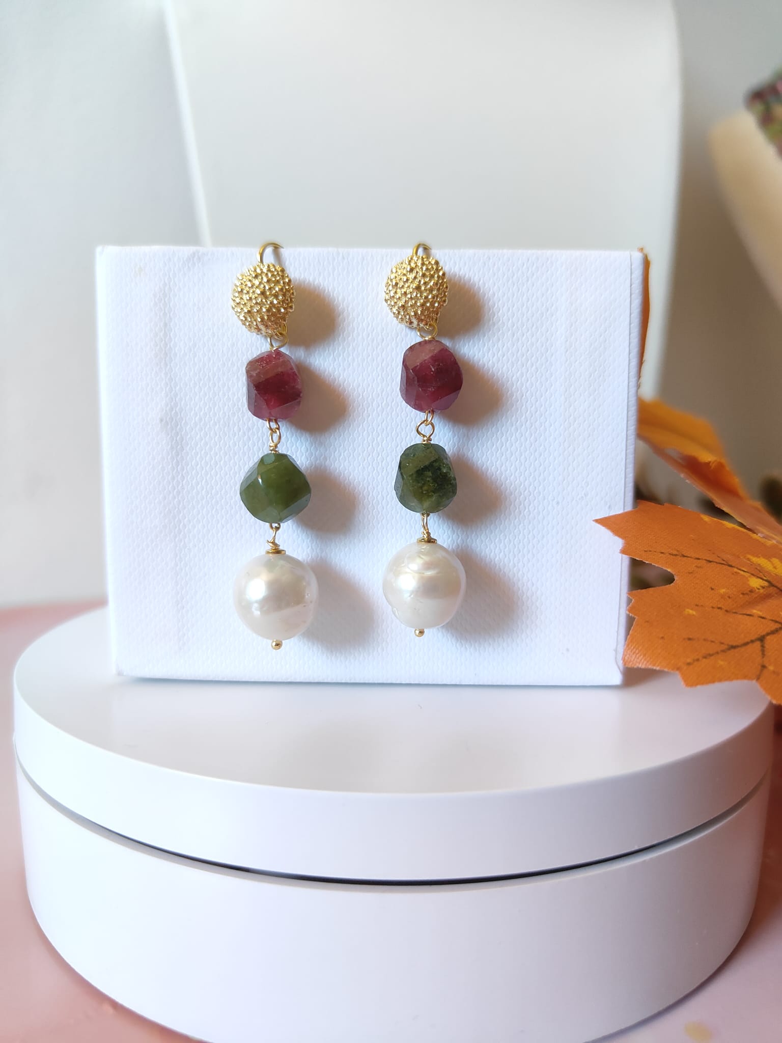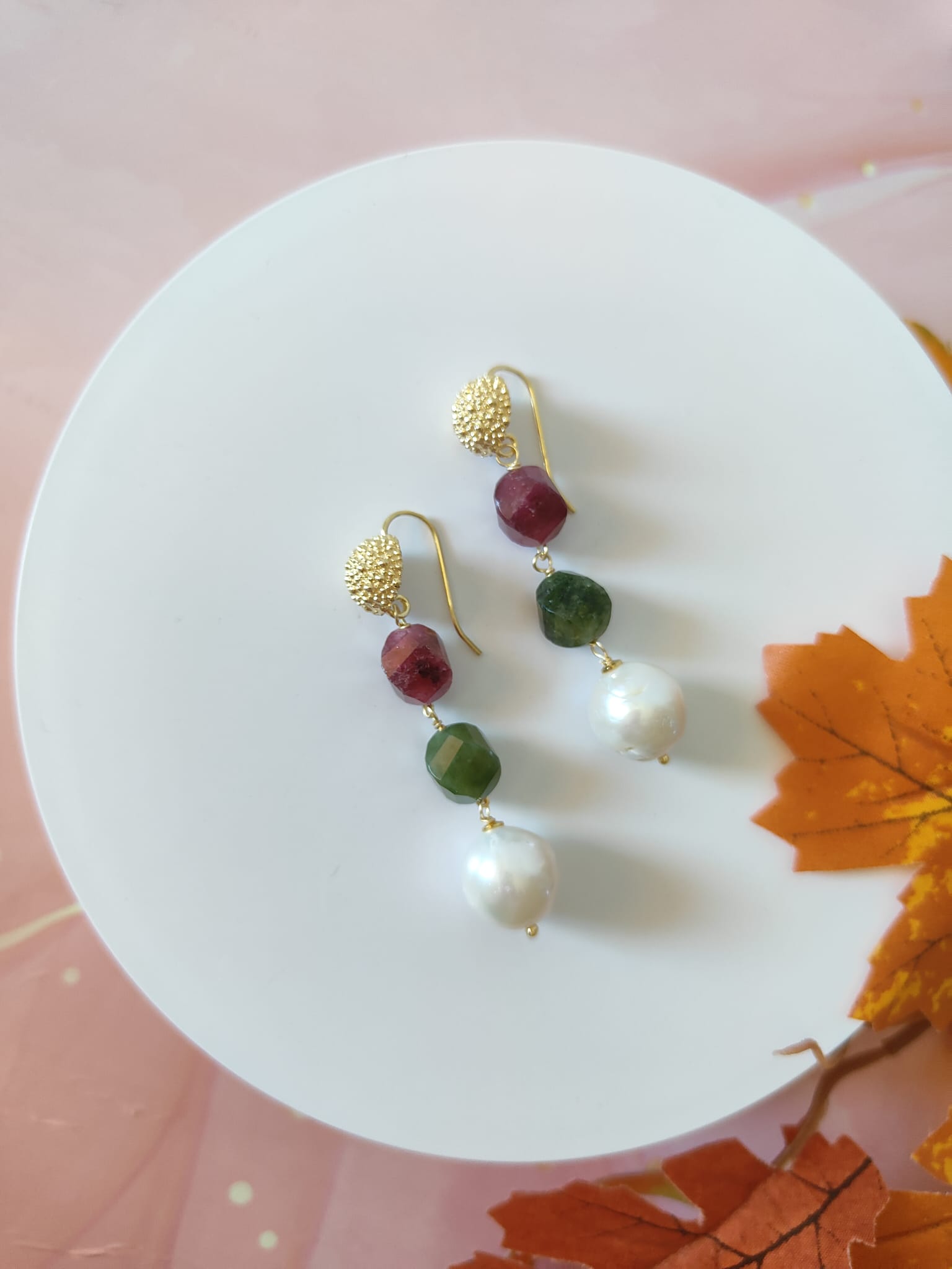 Gli orecchini, dal design elegante, uniscono la brillantezza del granato e la naturalezza della zoisite alla luminosità delle perle barocche. Leggeri e raffinati, sono montati con monachella in argento 925 placcato oro per garantire qualità e comfort.