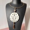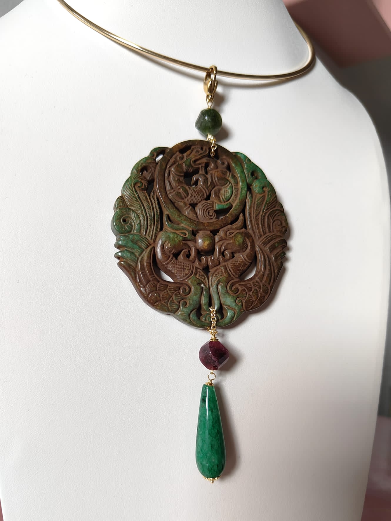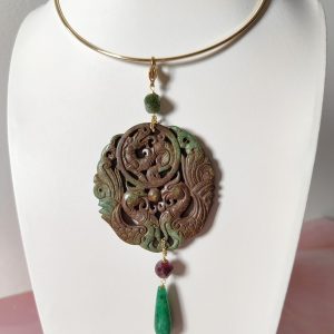 Il cuore del pendente è un mandala in giada antica intagliata, nei toni del verde e del marrone. I motivi incisi rappresentano prosperità e protezione, rendendo questo gioiello un autentico amuleto di energia positiva. Sopra il mandala, una avventurina verde traslucida riflette la luce con delicatezza, simbolo di calma e fiducia interiore. Al centro, un granato color prugna introduce profondità e calore, mentre la goccia finale in giada verde levigata completa la composizione con una nota di equilibrio naturale.