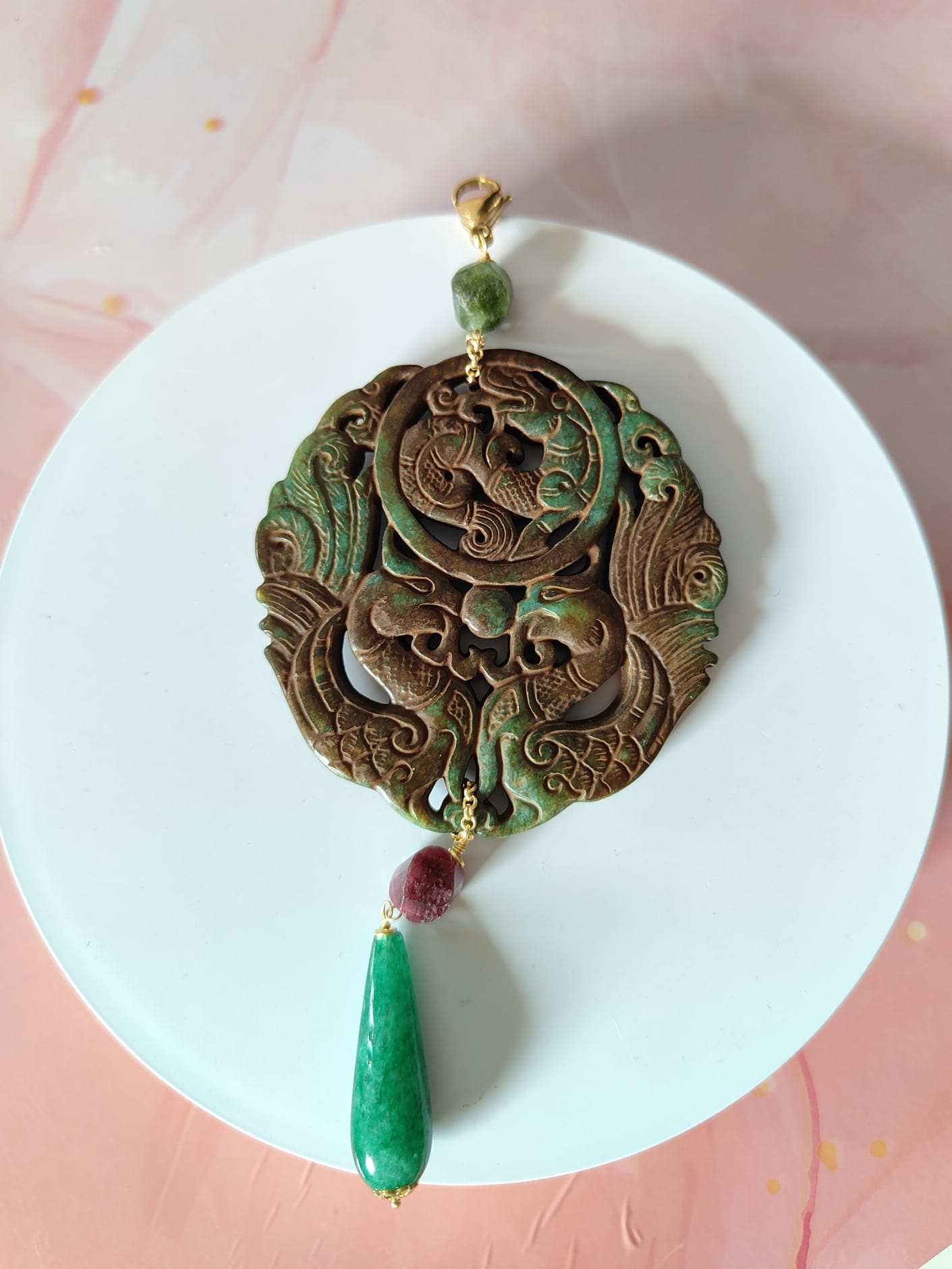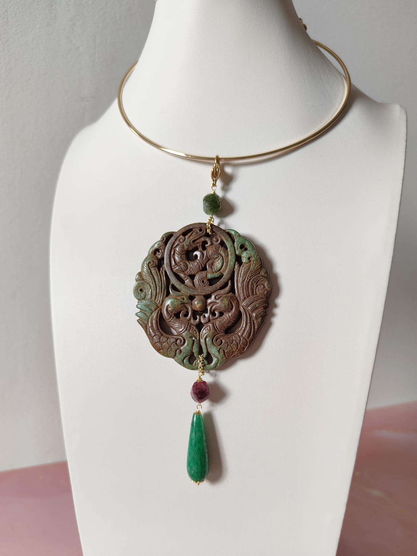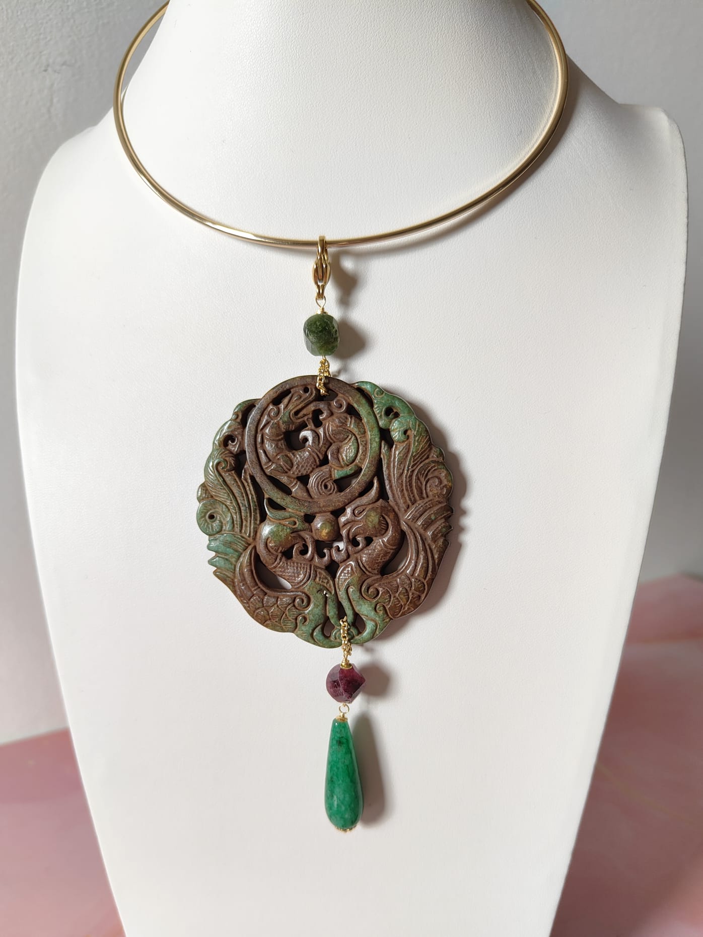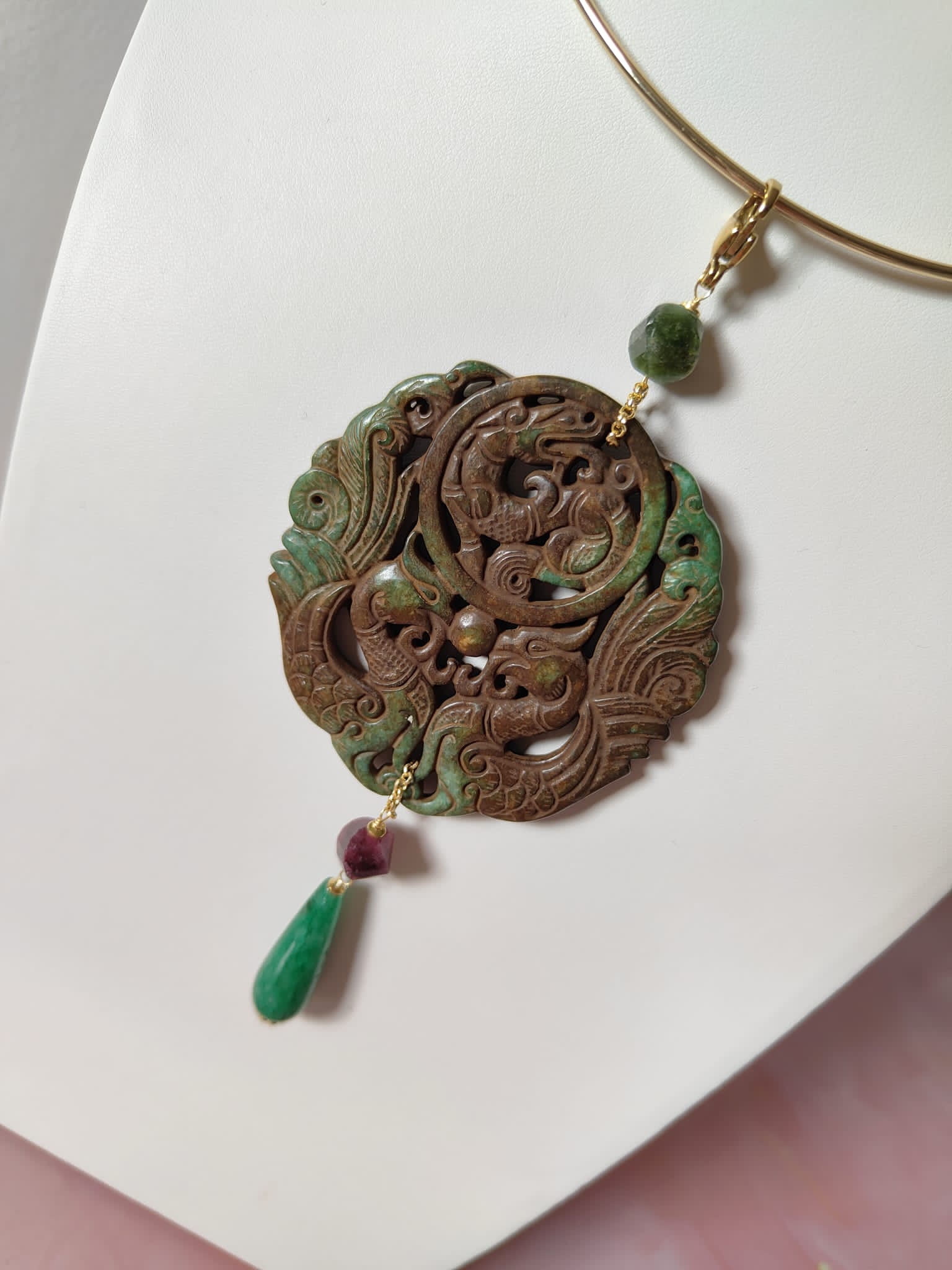 Il pendente giada verde antica con granato prugna e avventurina verde è un gioiello che unisce tradizione e raffinatezza. Realizzato interamente a mano, nasce dall’incontro tra pietre naturali e simbolismo orientale, per creare un equilibrio di luce e armonia.