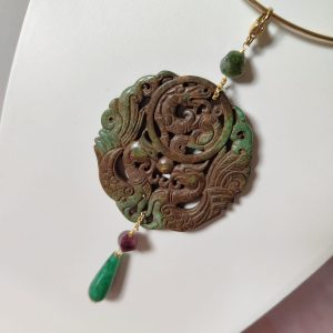 Questo pendente giada verde antica è un pezzo unico, non riproducibile in serie. Le immagini rappresentano esattamente il gioiello che verrà spedito, realizzato con materiali autentici e cura sartoriale.