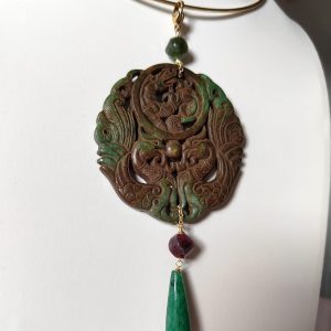 Materiali: giada antica, avventurina verde, granato prugna, giada verde levigata