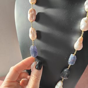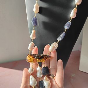 Questa collana lunga perle iolite ambra nasce dall’unione armoniosa tra tre materiali naturali che si esaltano a vicenda: la delicatezza delle perle barocche, la profondità blu-violacea della iolite e il calore trasparente dell’ambra naturale. Un gioiello scenografico, pensato per chi ama pezzi ricchi di personalità e desidera indossare un accessorio capace di raccontare una storia fatta di luce, movimento e colori autentici. La lunghezza di 64 cm permette di indossarla senza bisogno di regolarla, mentre il pendente lungo 9 cm aggiunge un tocco elegante e dinamico.