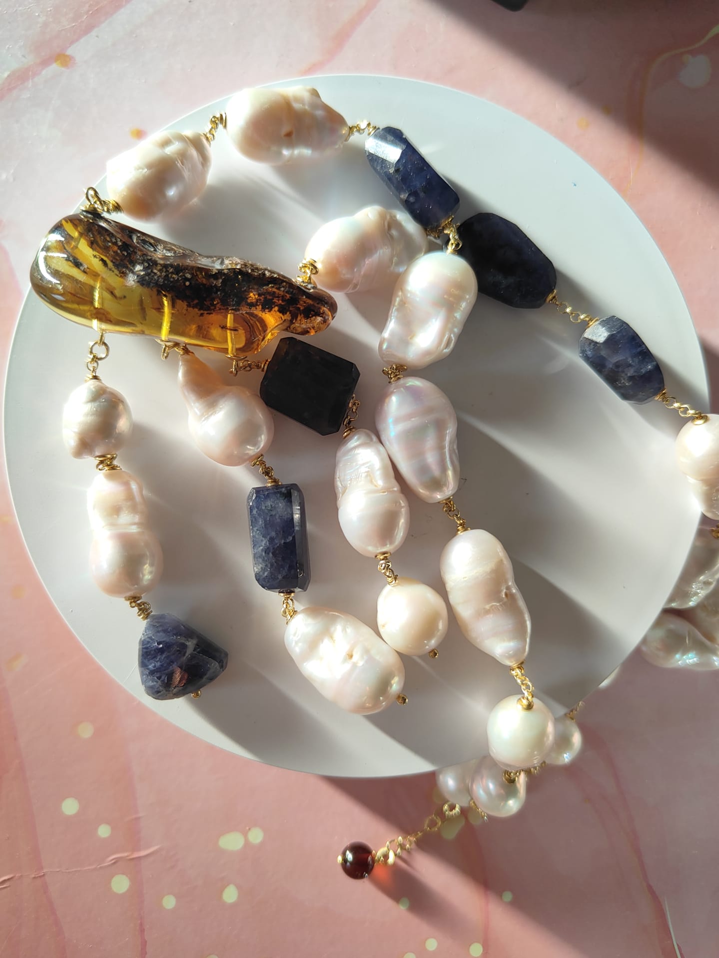 Materiali: perle barocche naturali, iolite naturale, ambra naturale, argento 925 placcato oro